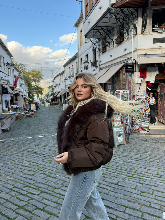 Xhup ne ngjyren kafe me pellush, eshte i shkurter me pellush eshte kombinimi perfekt i stilit...
