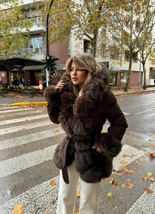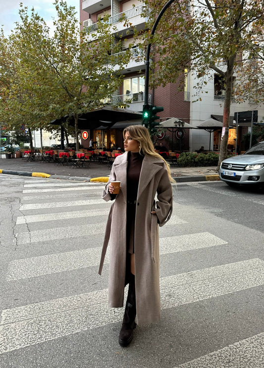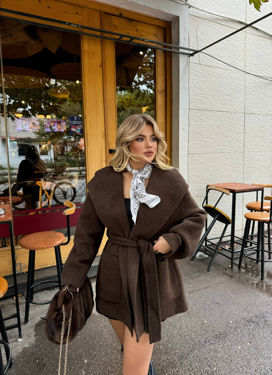 Pallto e shkurter kafe me rrip elegant, qe thekson belin dhe shton finese ne çdo...