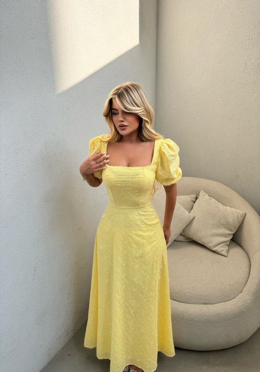 Fustan i shkurter ne ngjyren e verdhe. Eshte me rrip ne qafe dhe i thjeshte....