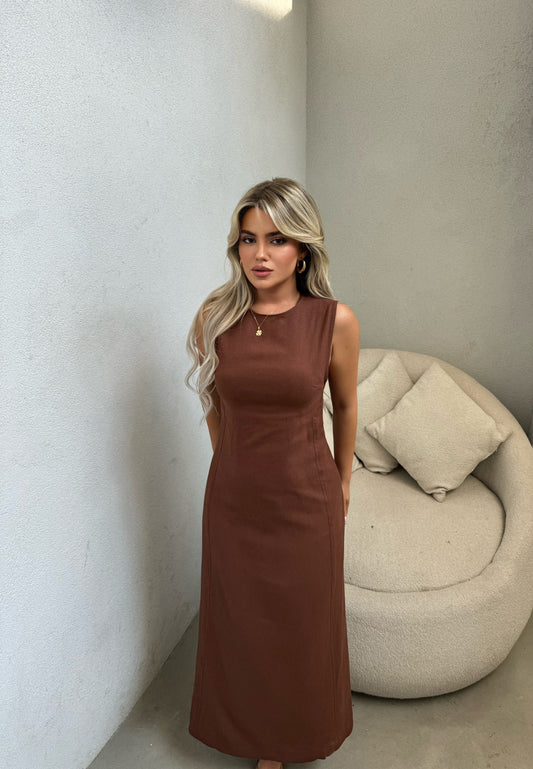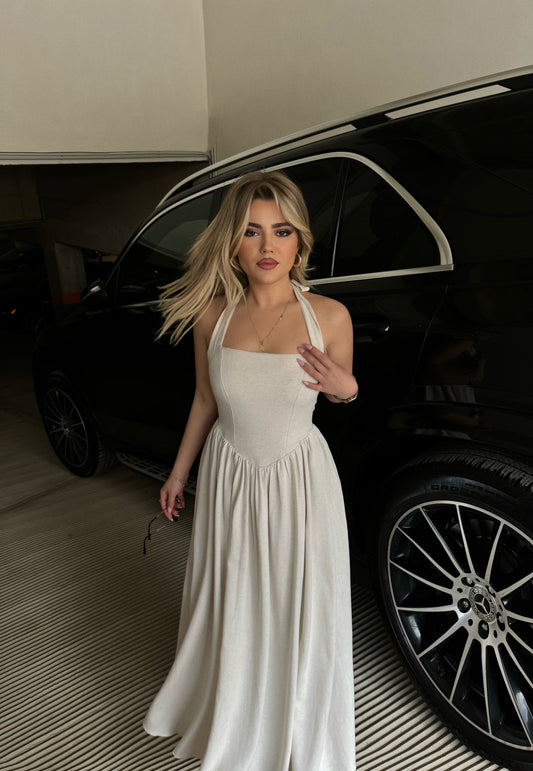 Fustan i gjate lino me lidhje ne qafe. Eshte me astar dhe ka super cilesi....
