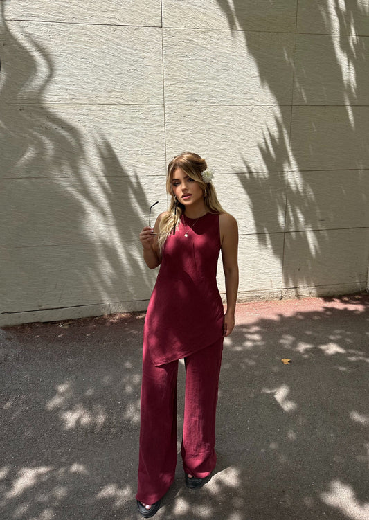 Pantallona te gjera, material lino. Vjen me llastik ne pjesen e belit. Jane me tegel...