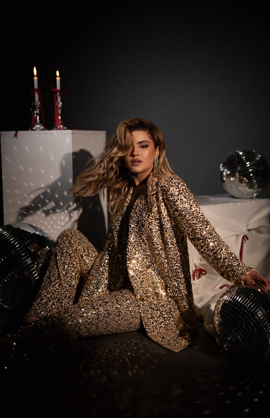 Set xhakete dhe pantallona te gjera me temina. Material i plote me astar brenda. Teper...