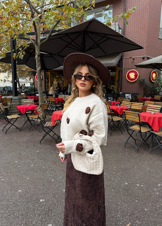 Pulover e butë në ngjyrë bezhë, e zbukuruar me lule të vogla kafe. E ngrohtë, e...