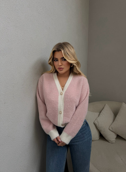 Pulover ngjyre bojeqielli.Pulover me krahe te gjate, detaje kopsash gold dhe jake V e bardhe...