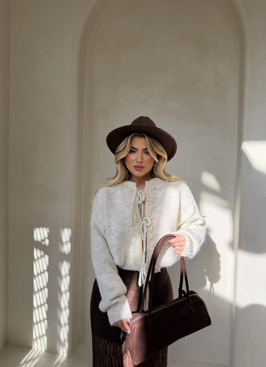 Cardigan me gjatësí normale, në ngjyrë bezhë me detaje kafe që i japin stil dhe...