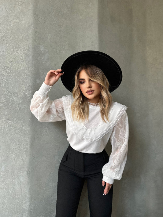 Pulover me dantelle ne pjesen e jakes. Jaka vjen ne forme V-je. Ka llastik ne...