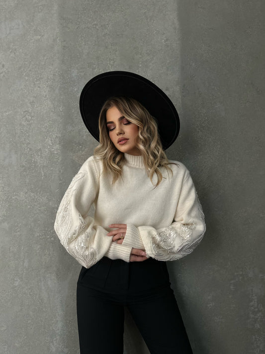 Pulover me krahe te gjate me gure te vegjel ne pjesen perpara. Ka material te...