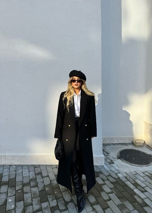 Pallto e gjatë e zezë me kopsa përpara, klasike dhe elegante, që ofron ngrohtësi dhe...