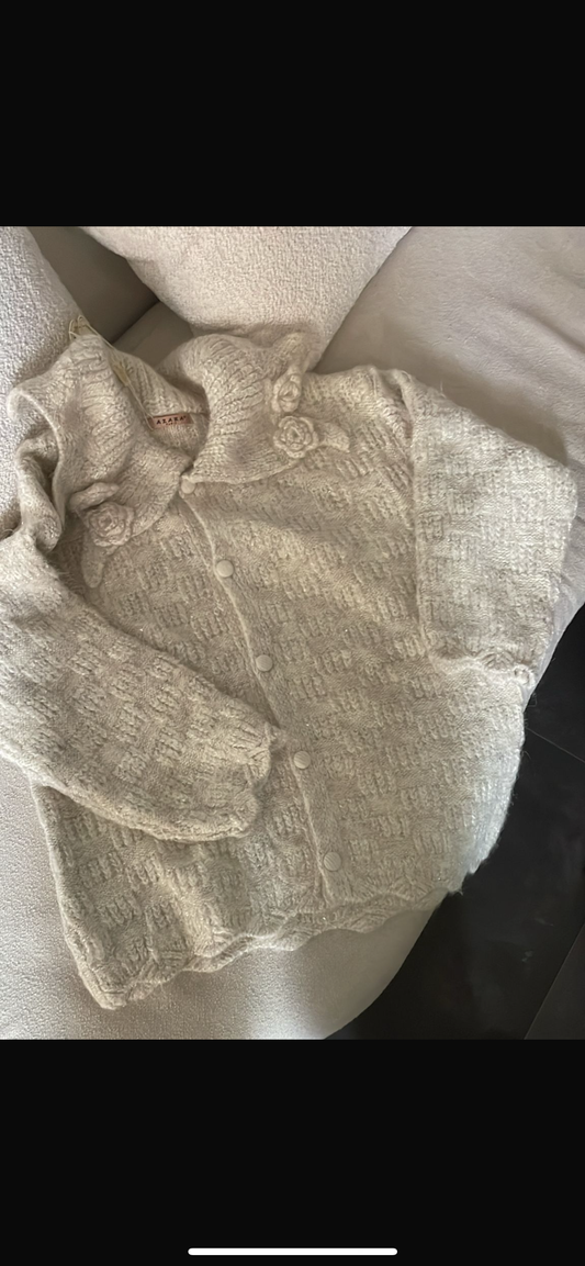 Pulover ne ngjyren bezhe,ne pjesen e jakes pulovra eshte me disa trendafila te punuar me...