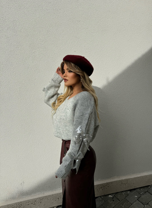 Pulovër e butë dhe komode në ngjyrë gri, me fjongo të ëmbla tek krahët që...