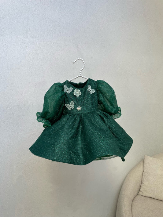Fustan jeshil me fjongo ne ngjyren e kuqe. Eshte me menget e fryra. Super cute...