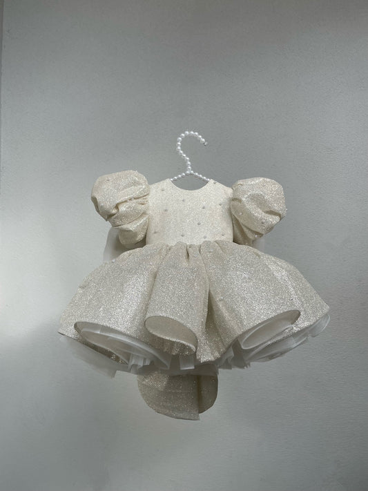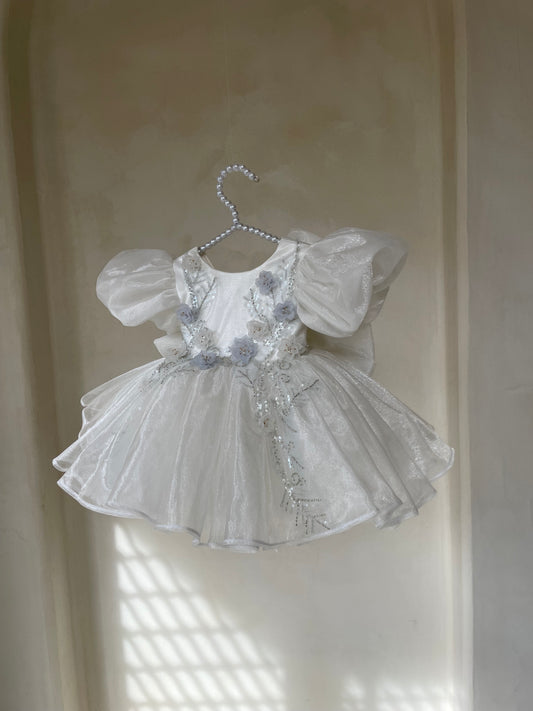 Fustan me xixa ne ngjyren e bardhe. Eshte i fryre dhe me detaje me flutura...