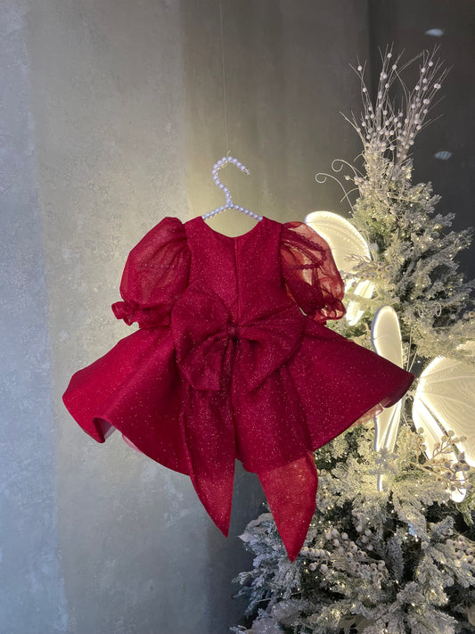 Fustan ne ngjyren e kuqe me xixa. Eshte i fryre dhe ka fjongo ne pjesen...