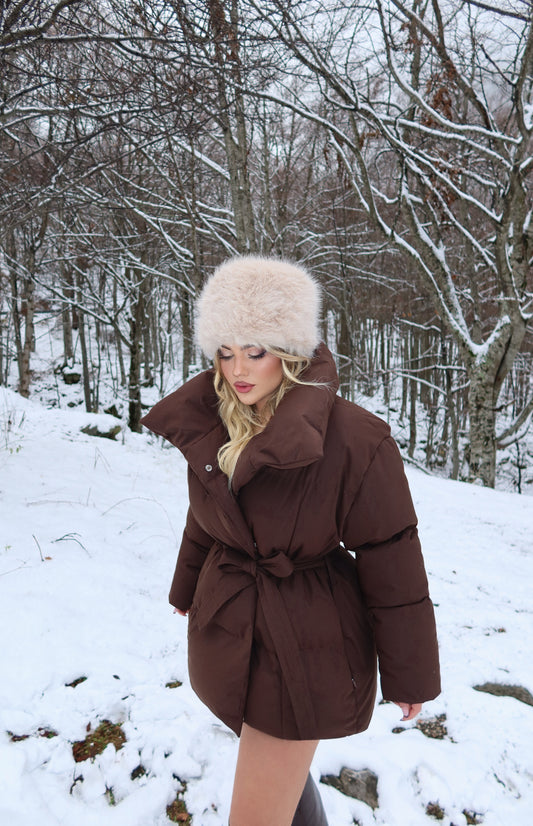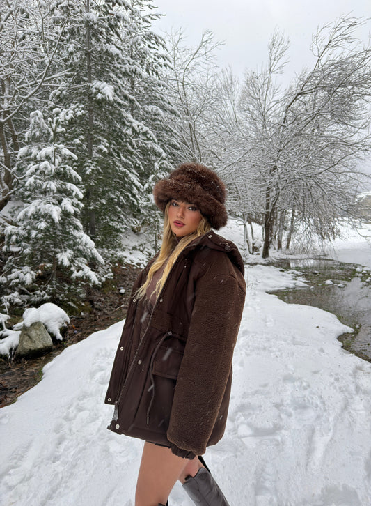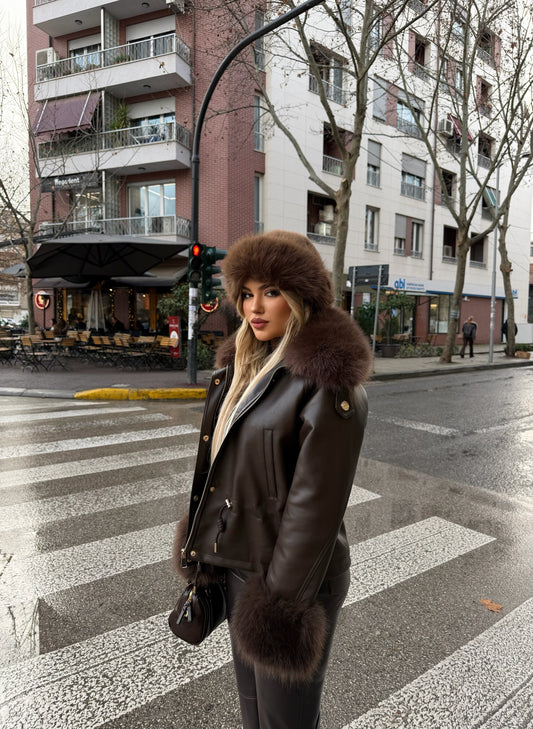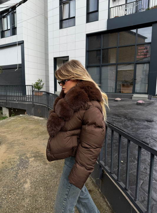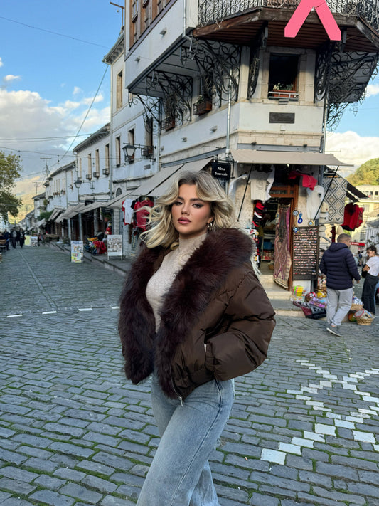 Xhup ne ngjyren kafe me pellush, eshte i shkurter me pellush eshte kombinimi perfekt i stilit...