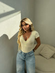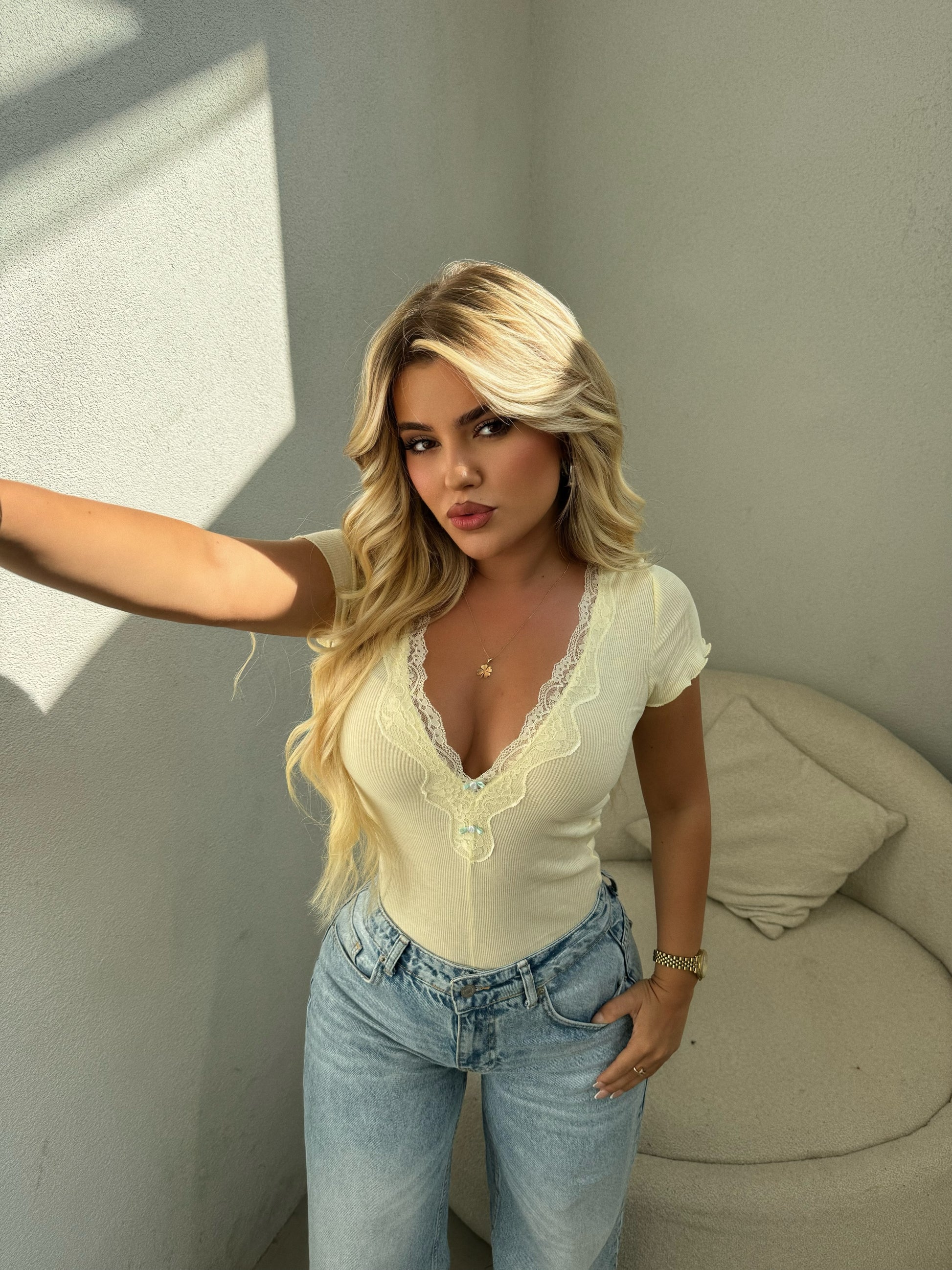Bluze e thjeshte me menge te shkurter. Eshte ne ngjyren e verdhe dhe roze. Mund ta kombinoni lehtesisht me cdo veshje. Ka material te plote dhe cilesi fantastike.