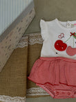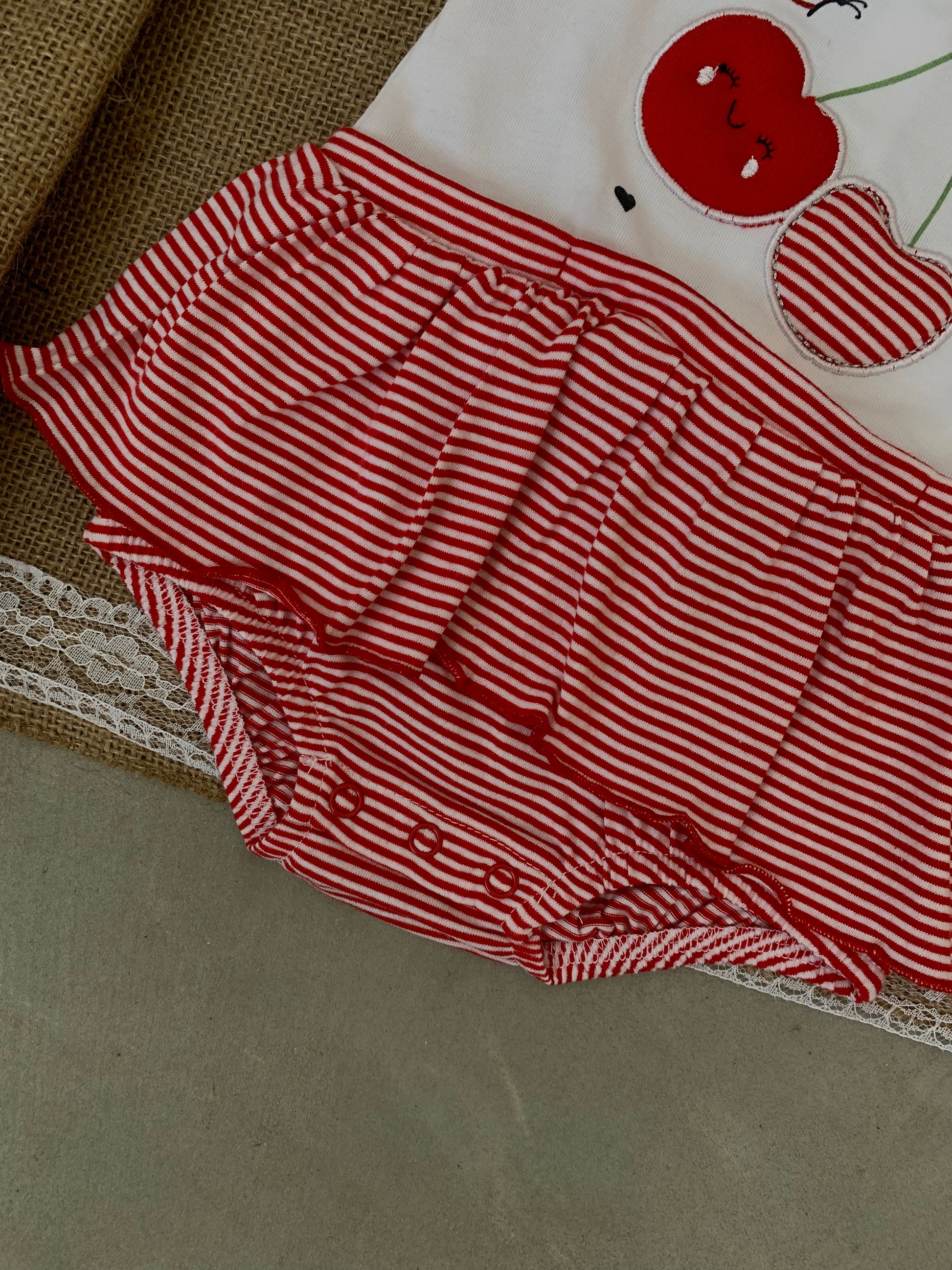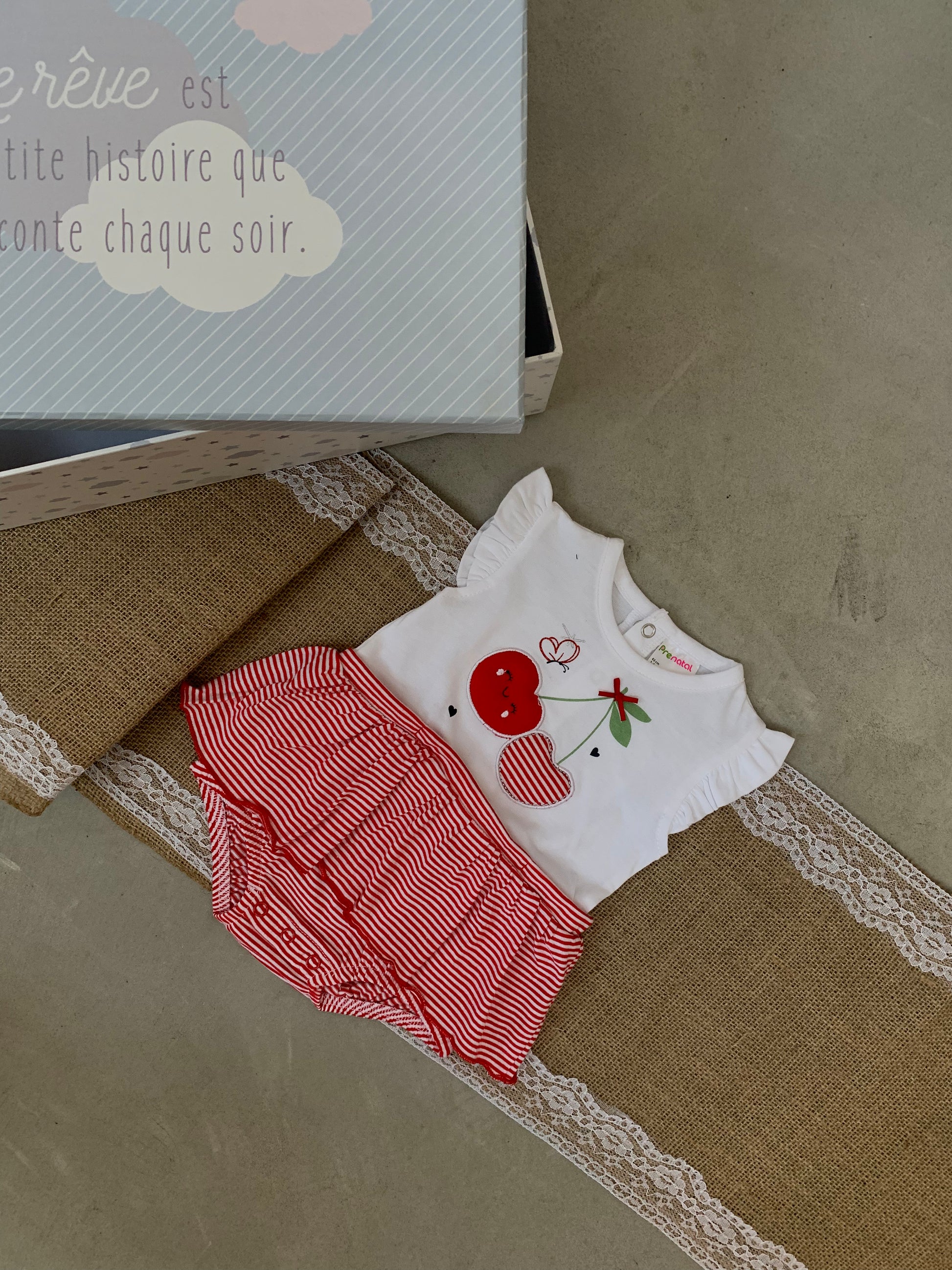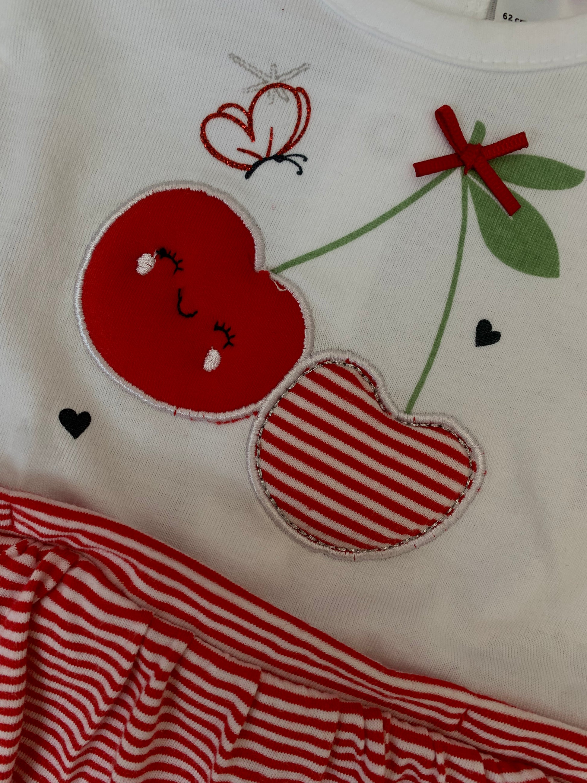 Body-fustan me qershi. Vjen me krahe te shkurter dhe pjesa e poshtme eshte me viza. Ka material te plote dhe cilesi fantastike.