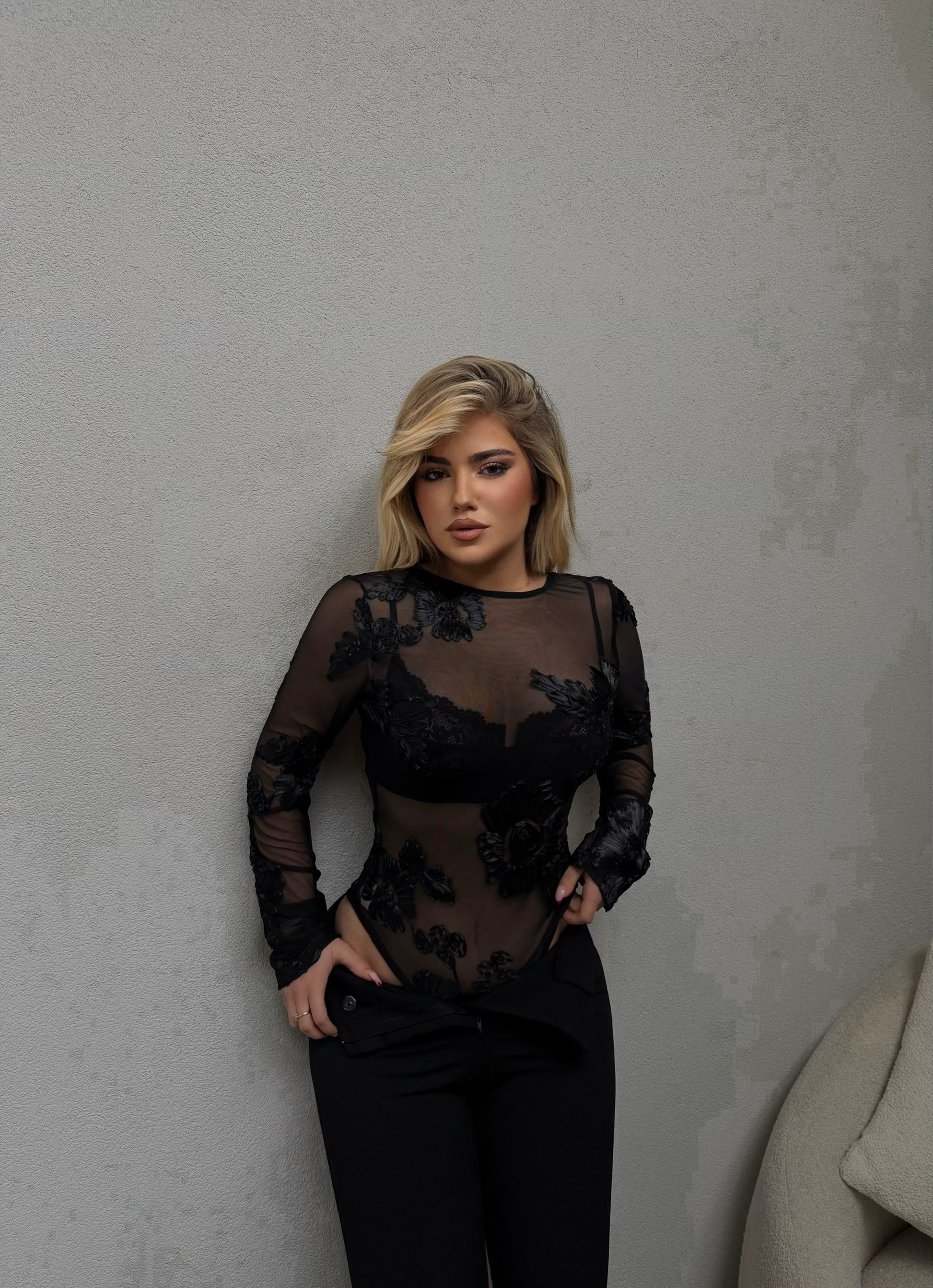 Body ne ngjyren e zeze me primt lulesh dhe mëngë të gjata, Material i bute dhe komod. Delikat, femëror dhe perfekt për çdo kombinim.