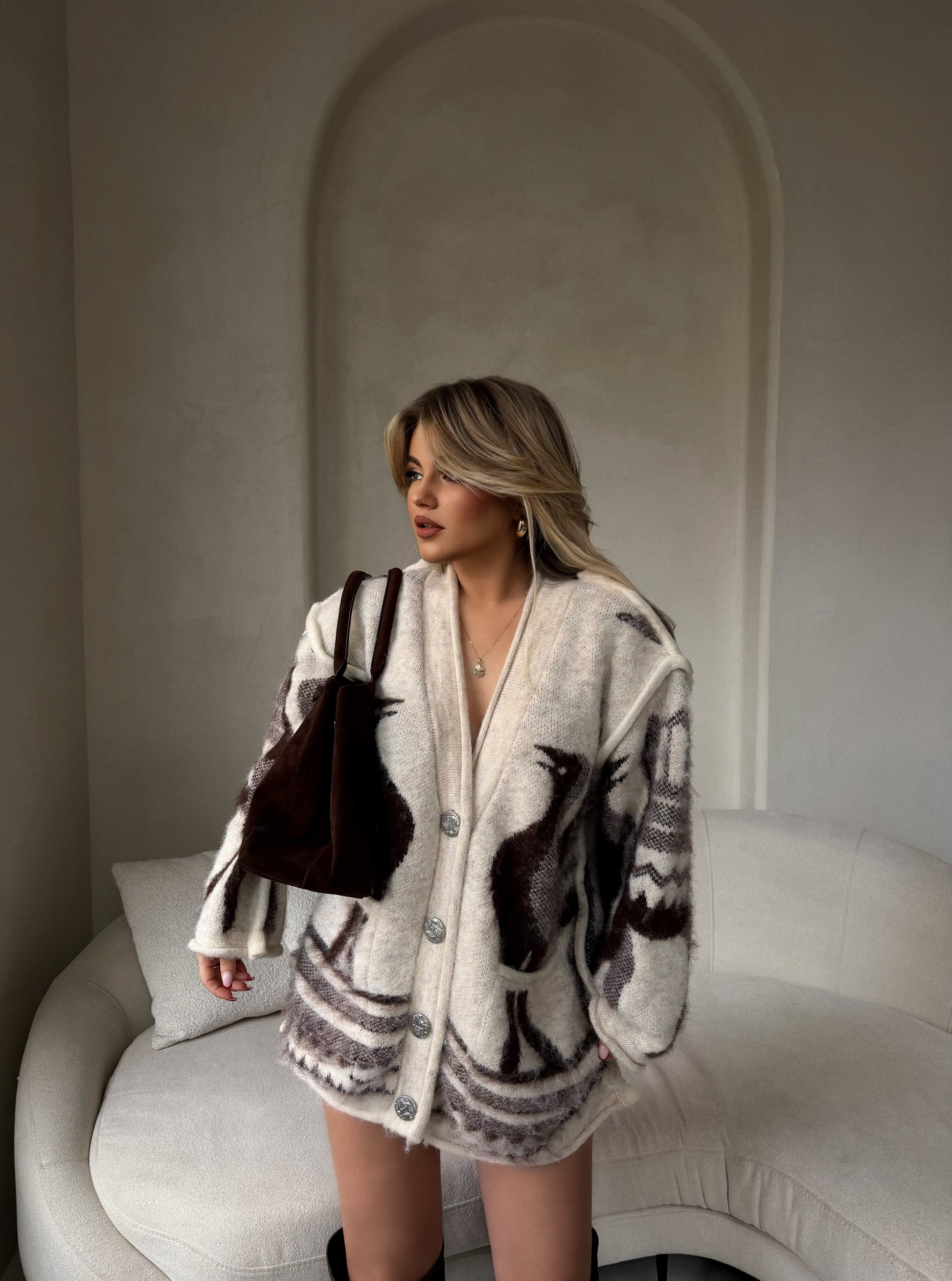 Cardigan me gjatësí normale, në ngjyrë bezhë me detaje kafe që i japin stil dhe ngrohtësi. Material i butë dhe i rehatshëm, perfekt për veshje të përditshme dhe kombinime të lehta.
