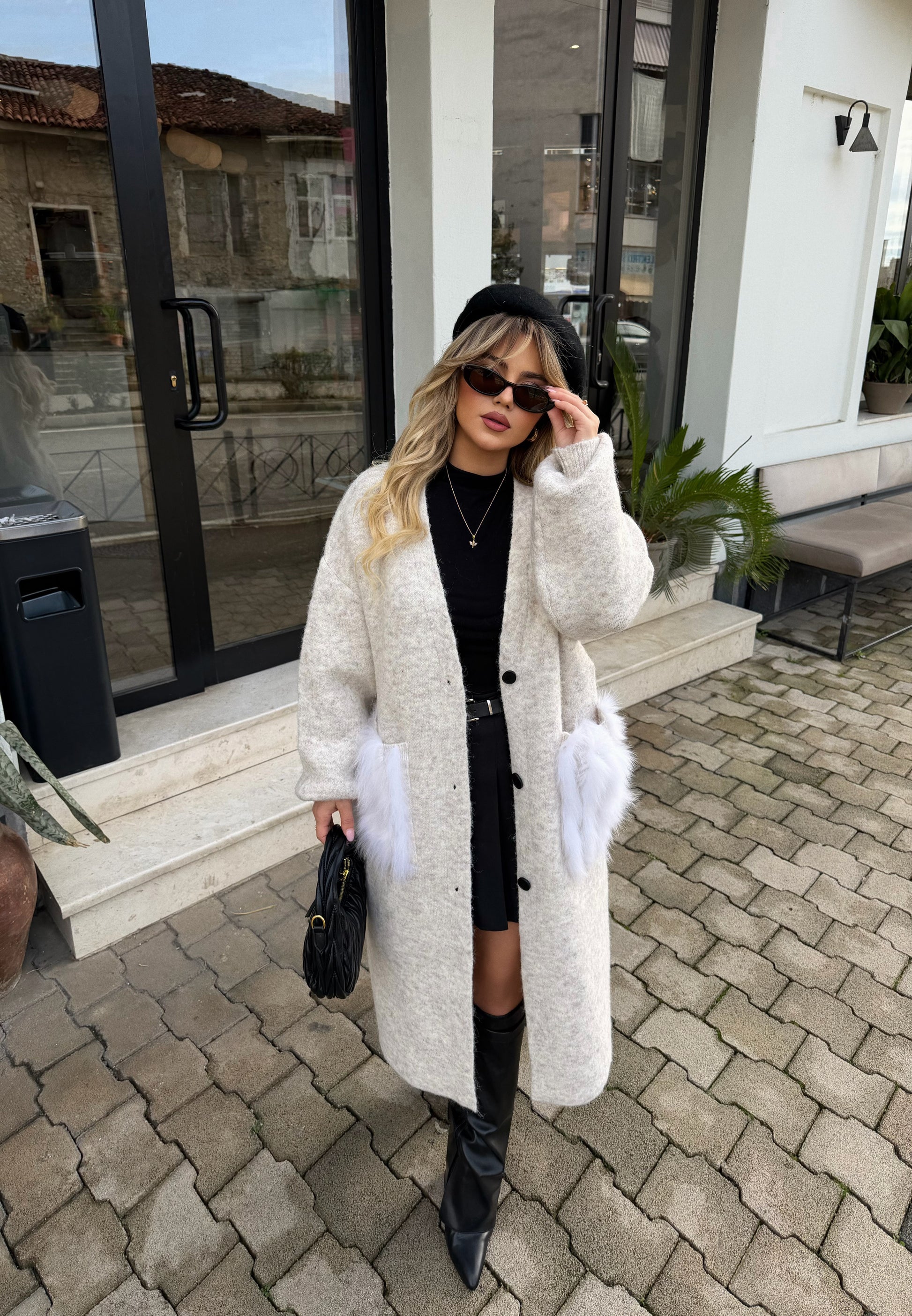 Cardigan ne ngjyren bezhe, vjen me nje dizajn teper te vecante dhe stil ne pjesen e xhepave eshte me pupla ne ngjyren e bardhe, ne pjesen perprara ka dy kopsa ne ngjyren e zeze. Material i bute dhe i ngrohte per ditet e ftohta te dimrit.