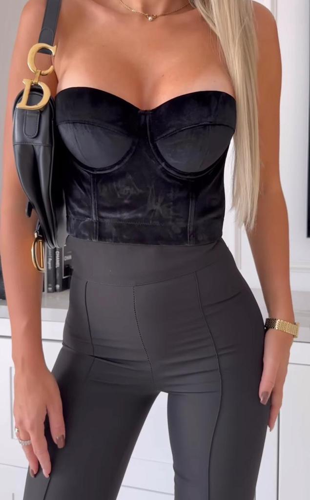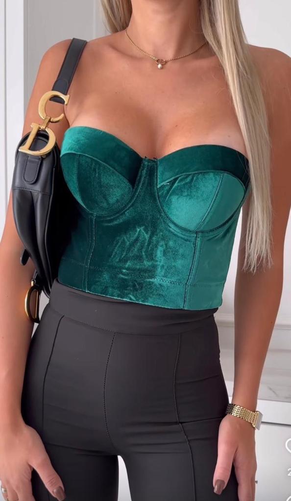 Crop velvet me rripa te holle. Mberthimi behet me kopsa ne pjesen e pasme. Rripa jane te rregullueshem. Modeli vjen ne tri ngjyra:jeshile, bezhe dhe i zi.