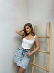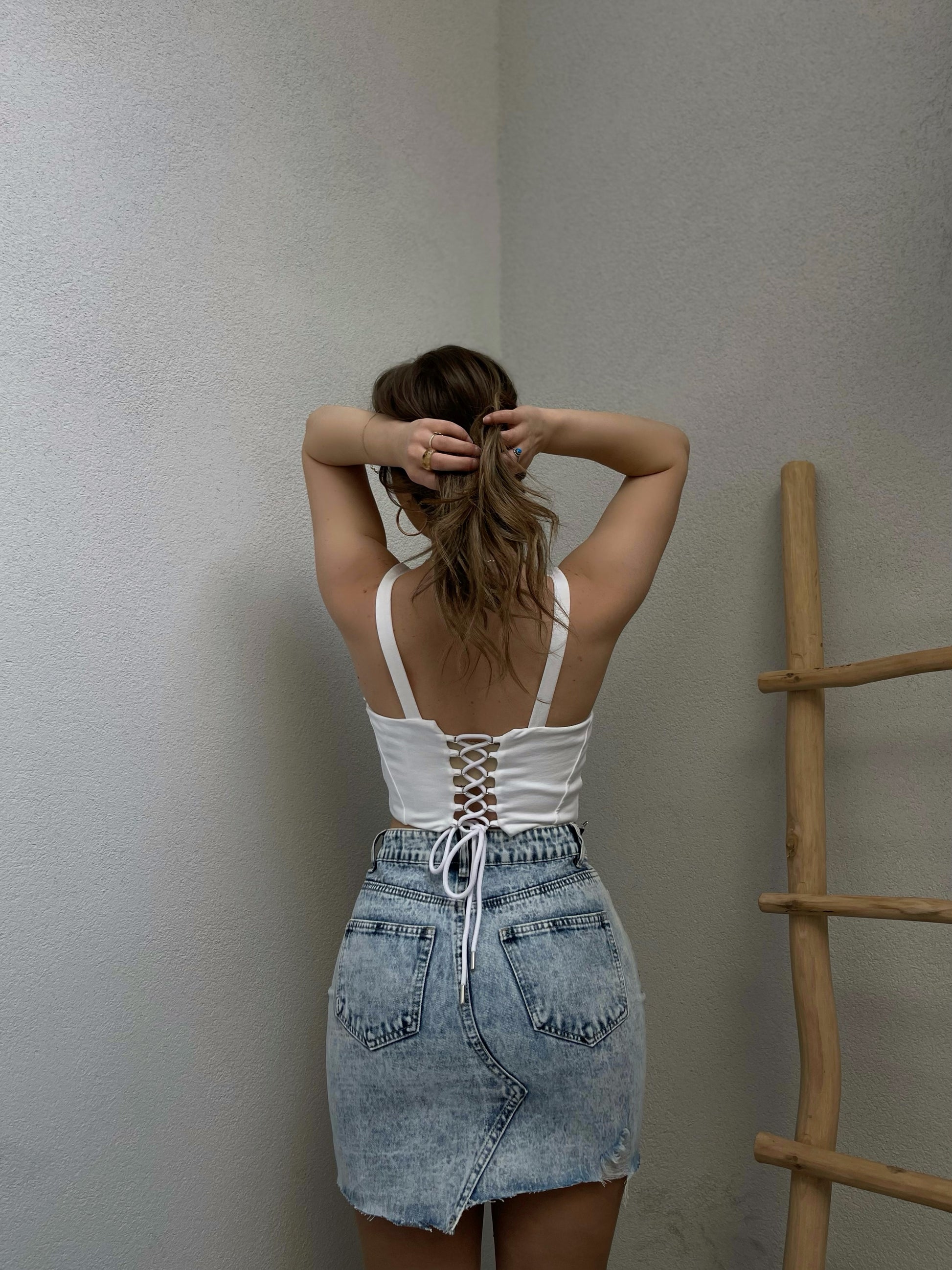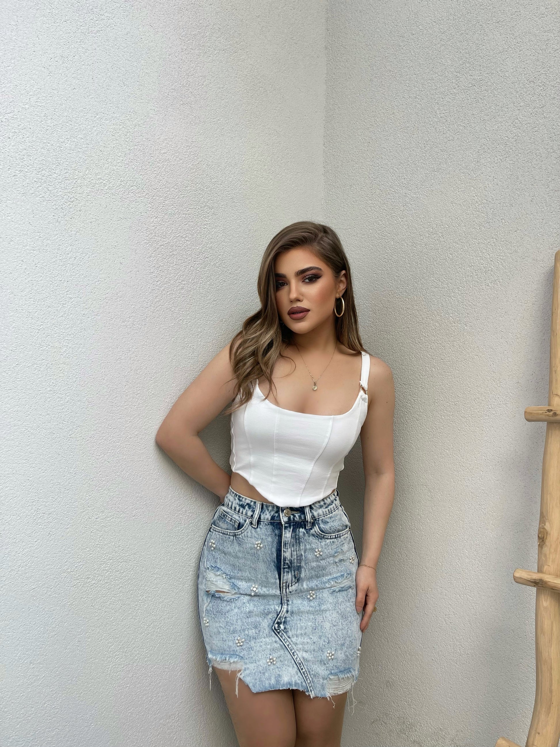 Fund i shkurter me gure ne forme lulesh. Ka te grisura ne pjesen perpara dhe mberthimi behet me ane te zinxhirit ne pjesen e siperme. Ka material te plote dhe cilesi fantastike.