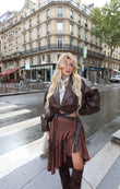 Fund ngjyre kafe, me shtresa dhe detaje kopsa, i gjate deri posht gjurit. Model modern dhe elegant, perfekt per kombinime unike.