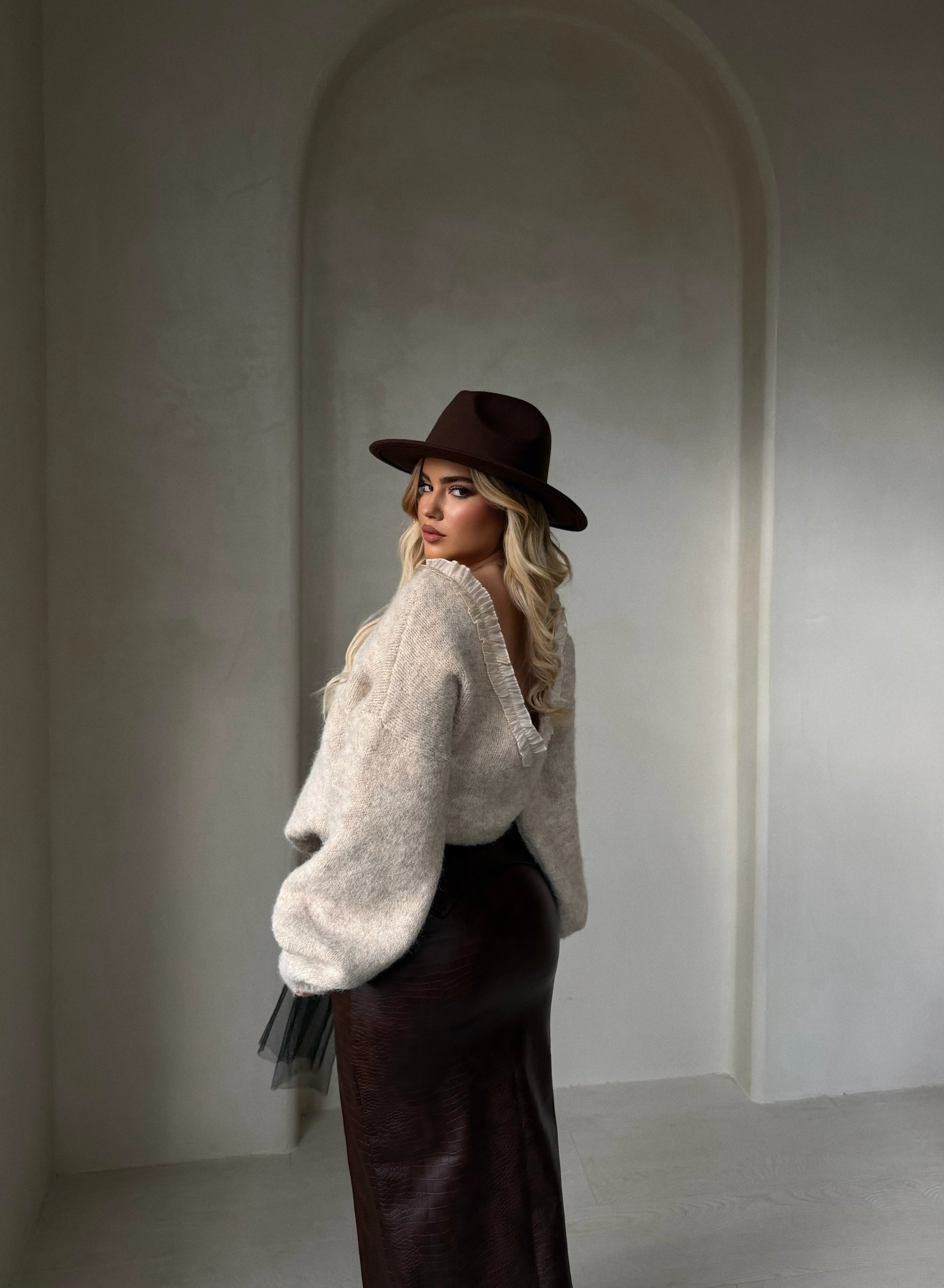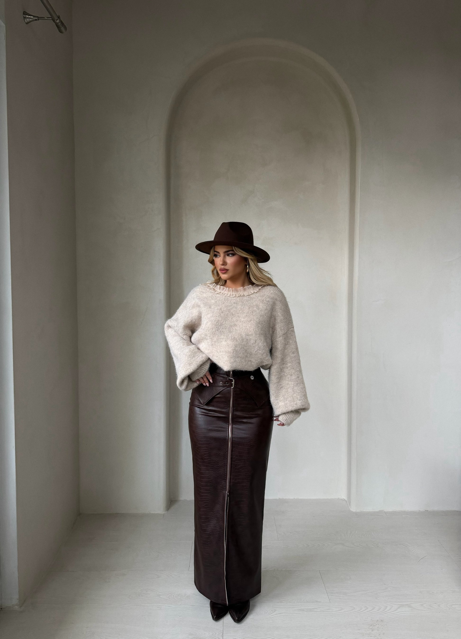 Fund ngjyre kafe. Fund i gjate ngjyre kafe, material lekure i cilesise premium dhe ka detaje te zinxhirit dhe rripit.