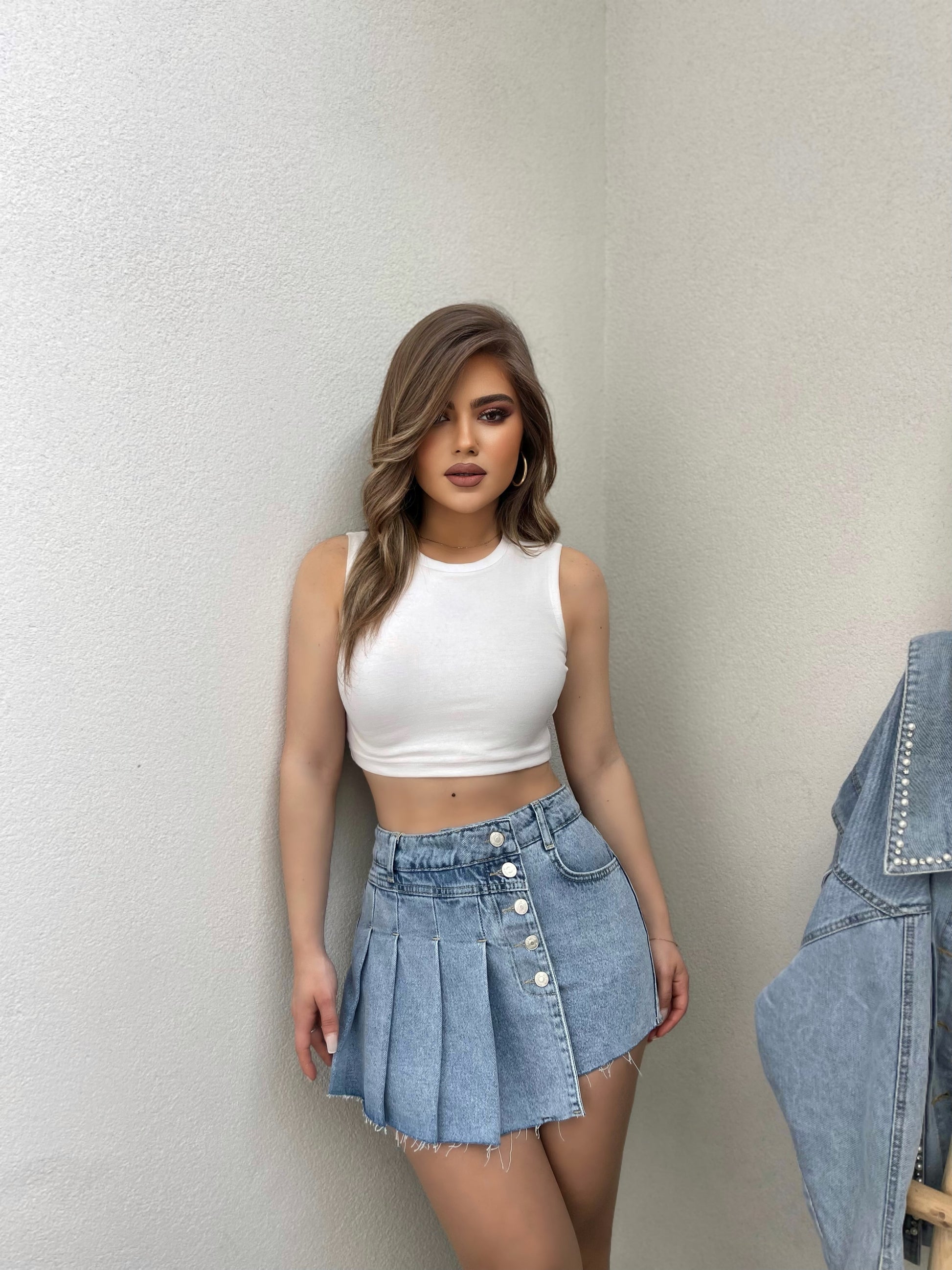 Fundpantallone i shkurter me kopsa ne pjesen perpara. Ka gjatesi normale dhe prerje te rregullt. Mberthimi behet me ane te kopsave. Lehtesisht i kombinueshem dhe super stil.