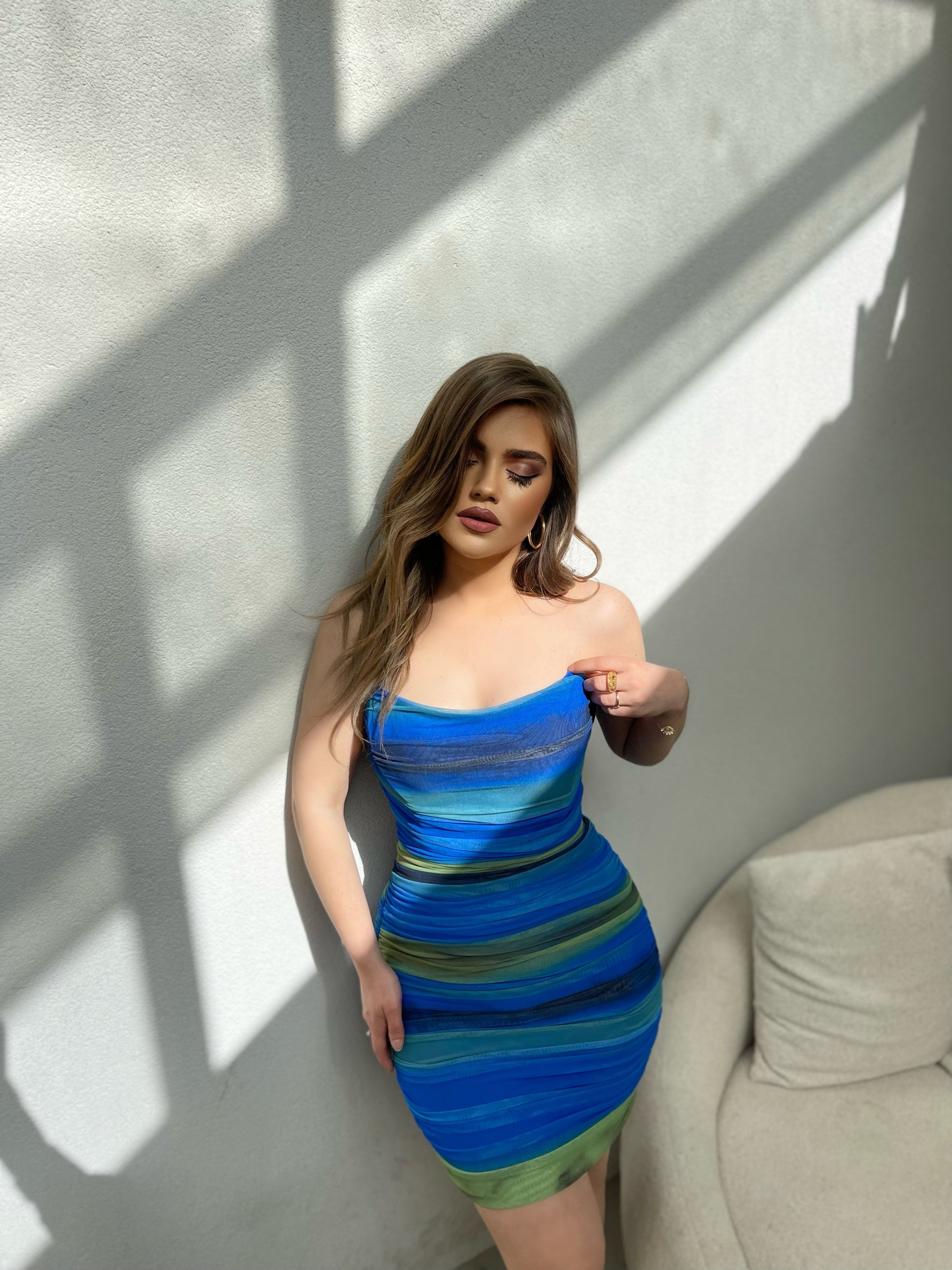 Fustan bust me rrudha. Vjen ne nje kombinim perfekt ngjyrash dhe mberthimi behet me ane te zinxhirit mbrapa. Ka material te plote dhe cilesi fantastike.