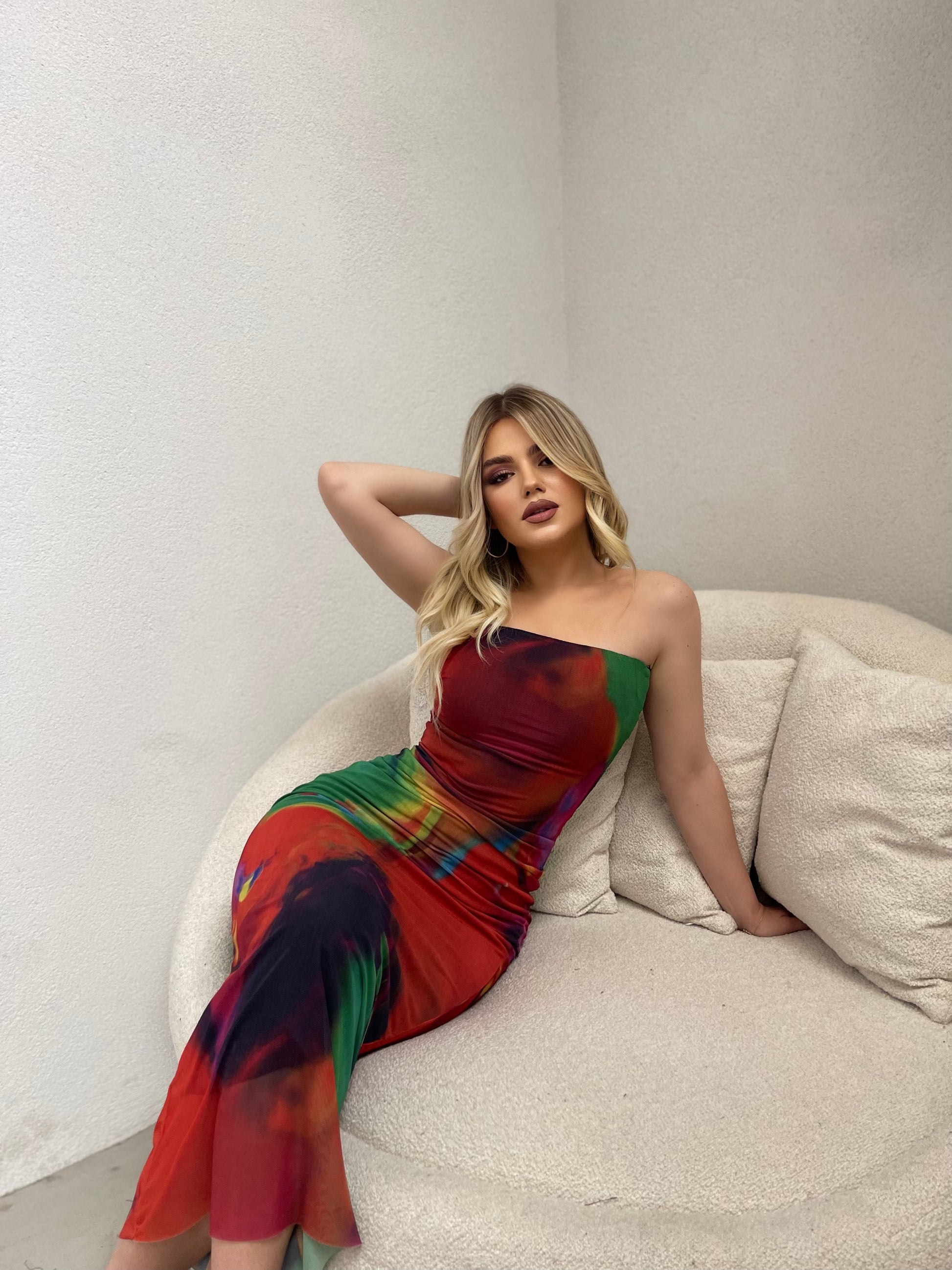 Fustan bust i gjate me shume ngjyra. Ka kombinim perfekt te ngjyrave dhe cope te dyfishte. Super material dhe cilesi fantastike.