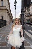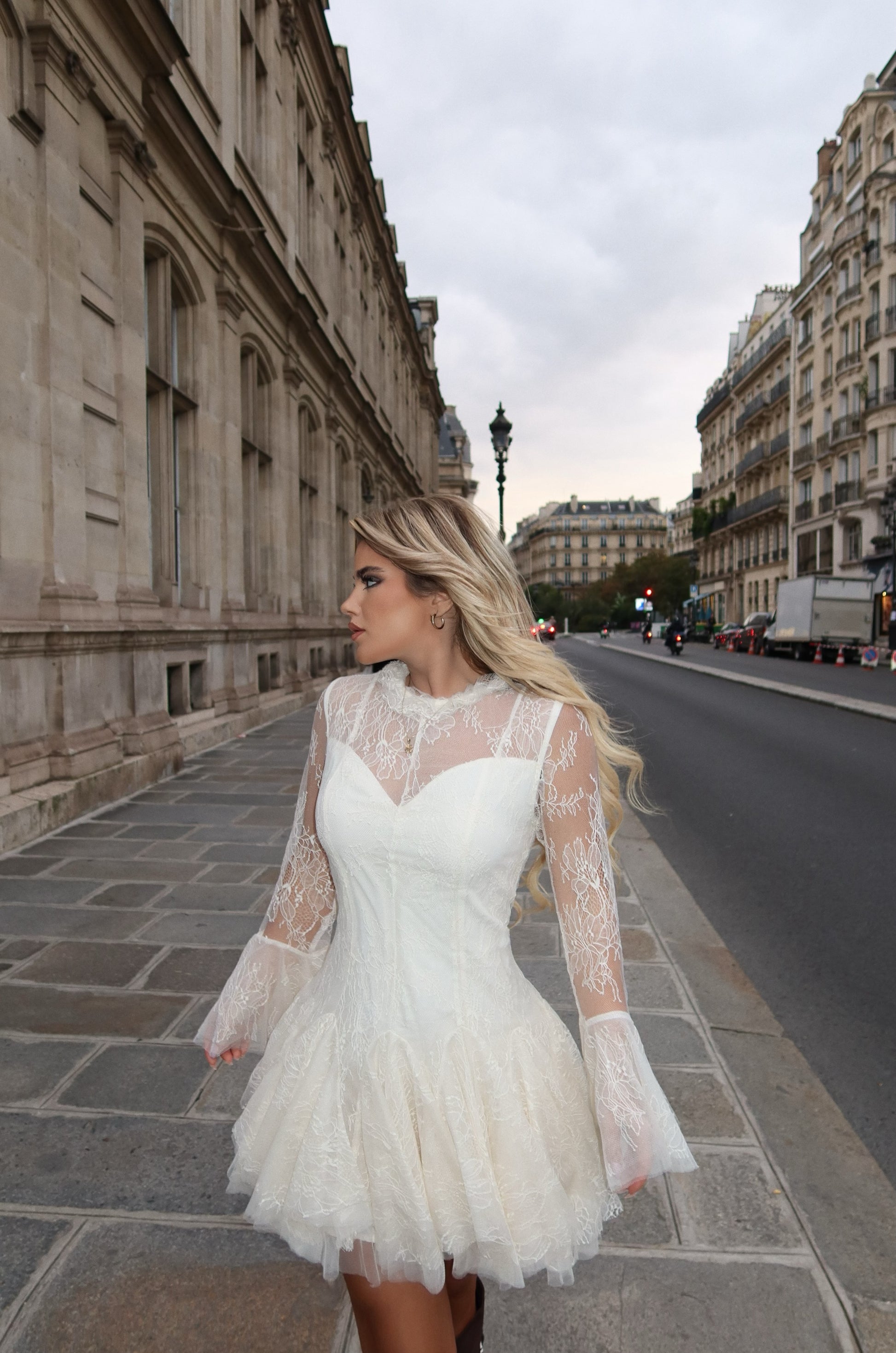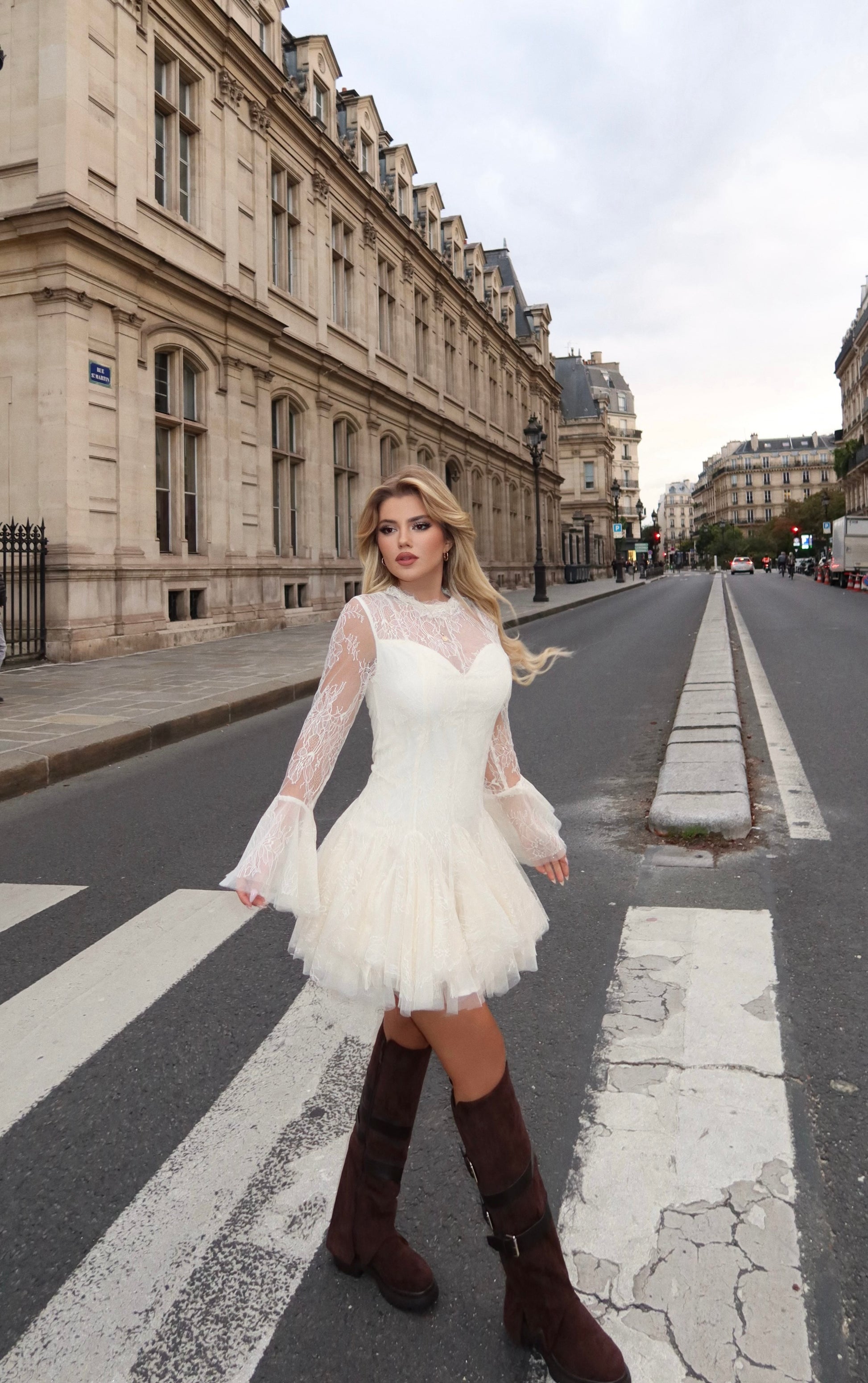 Fustan i shkurter dantelle. Eshte me menget e gjata dhe me pala ne pjesen poshte. Ka material te plote dhe cilesi fantastike. Shume stil dhe komod.