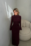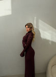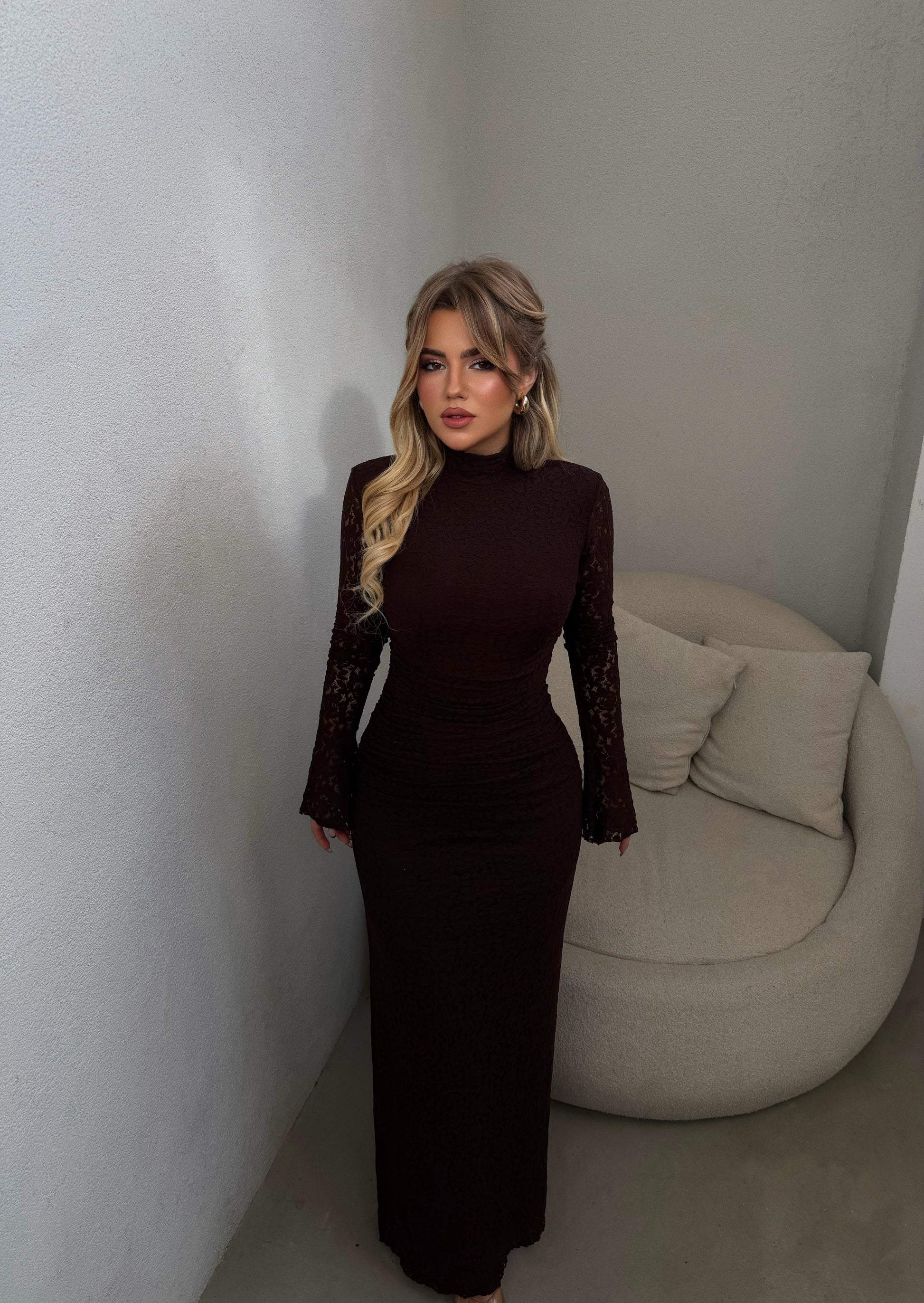 Fustan i gjatë dantelle me krahë të gjatë, elegancë klasike për mbrëmje dhe evente të veçanta.