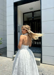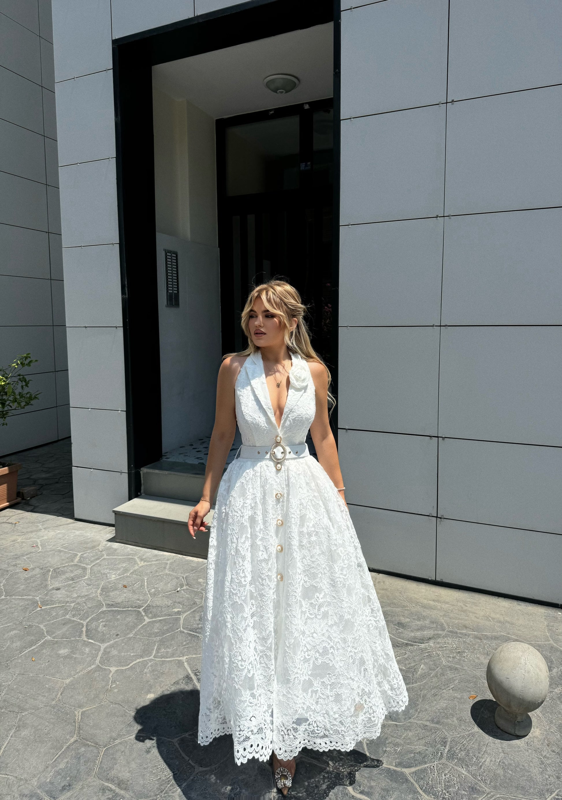 Fustan me dantella me kurrizin e hapur. Ka rrip ne bel dhe trendafil qe vendoset sipas deshires. Me astar poshte dhe rrjete qe i jep pamje me bukur.