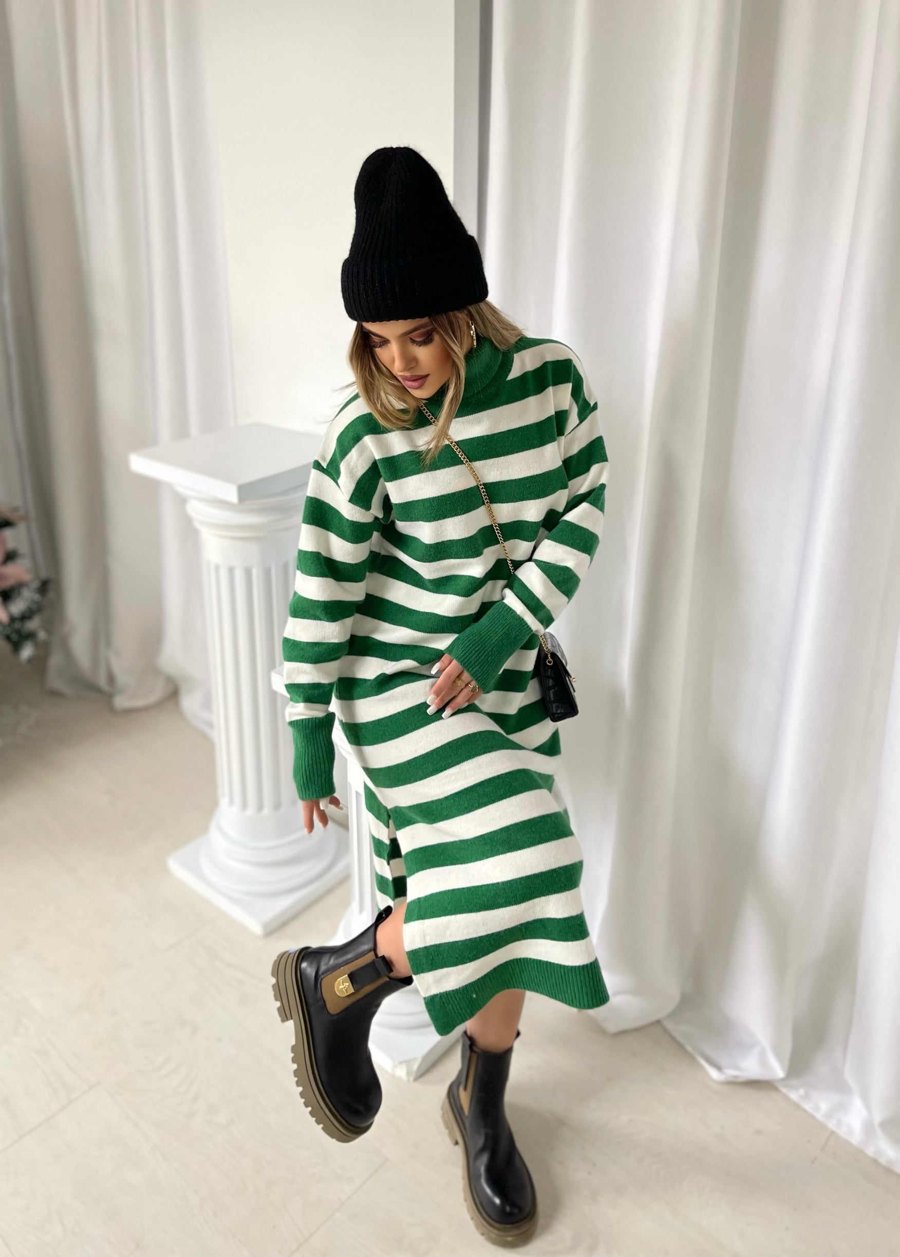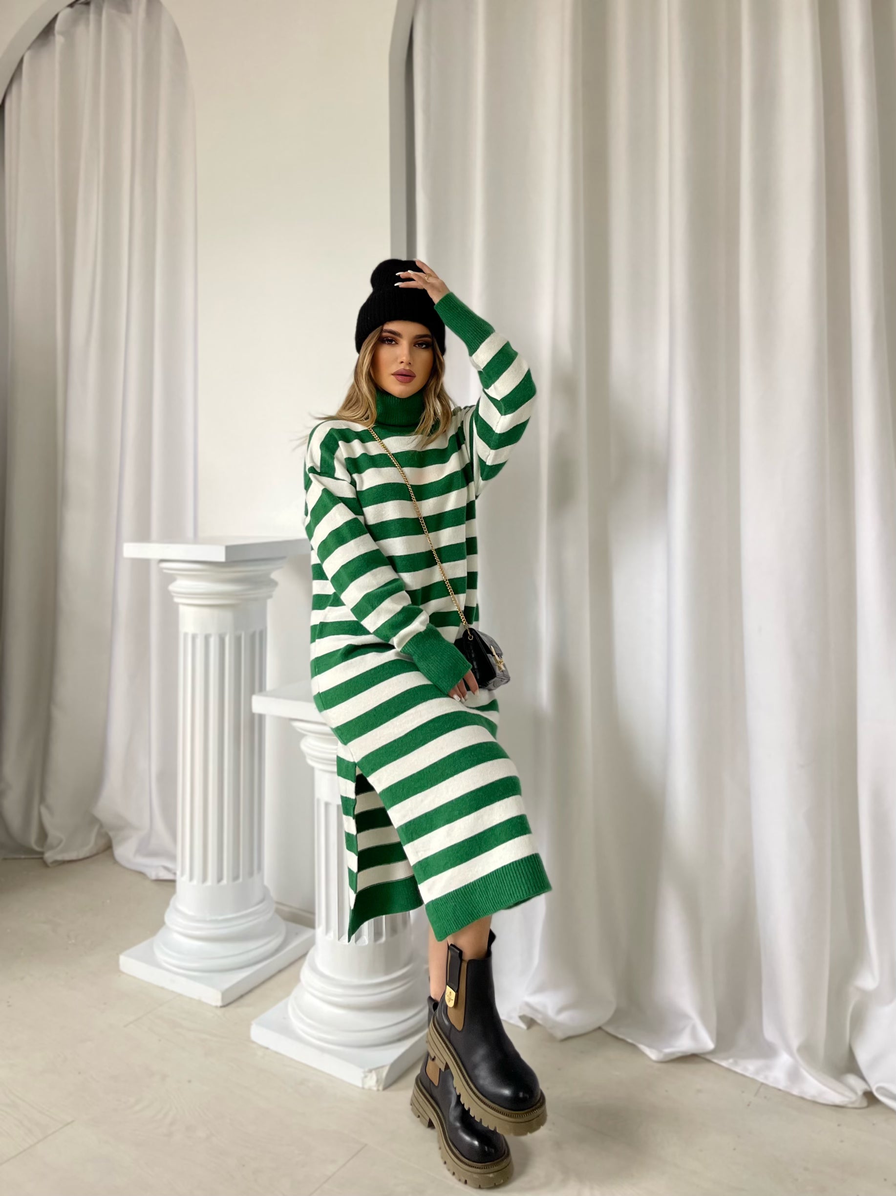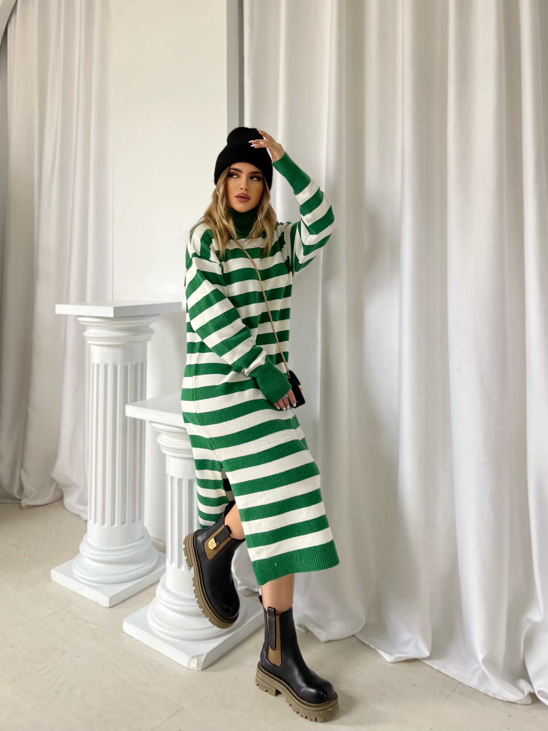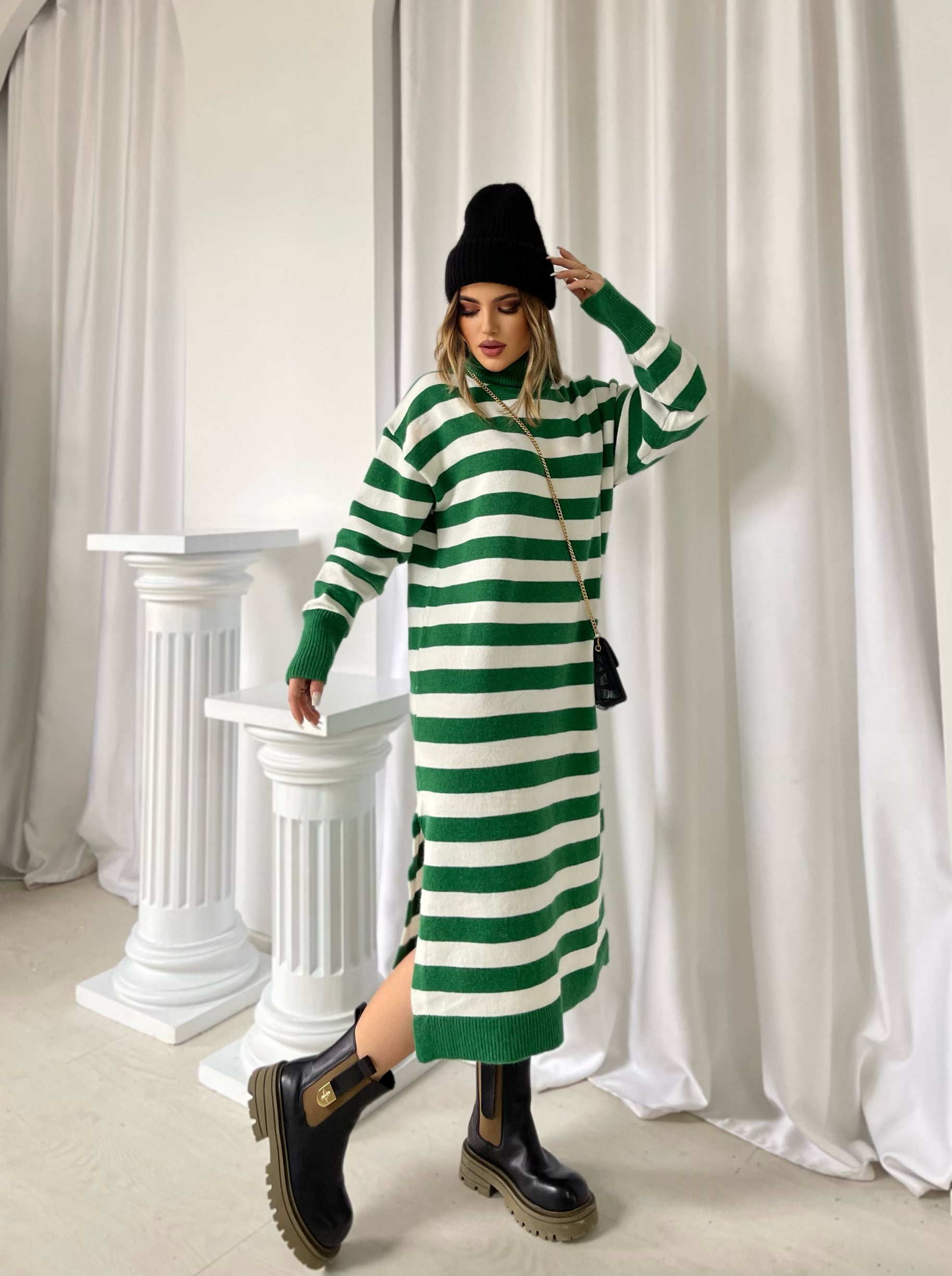 Fustan i trikotuar me golf me menge te gjata. Fustani eshte i gjate dhe me dizenjo me viza. Menget ne fund jane me doreza. Modeli vjen ne dy ngjyra: jeshil dhe i zi.