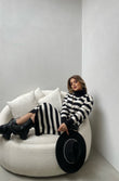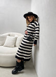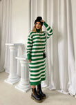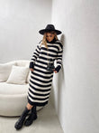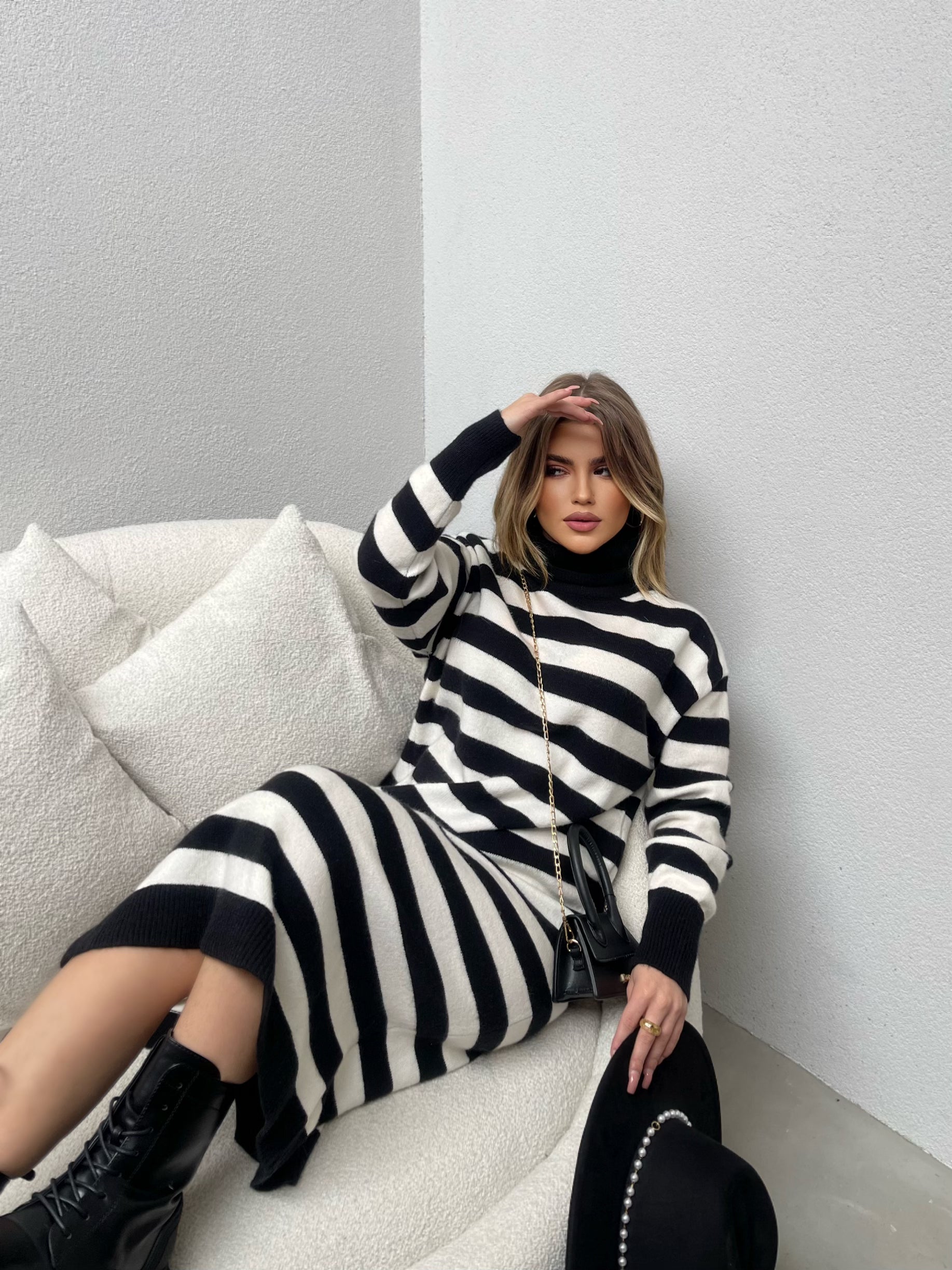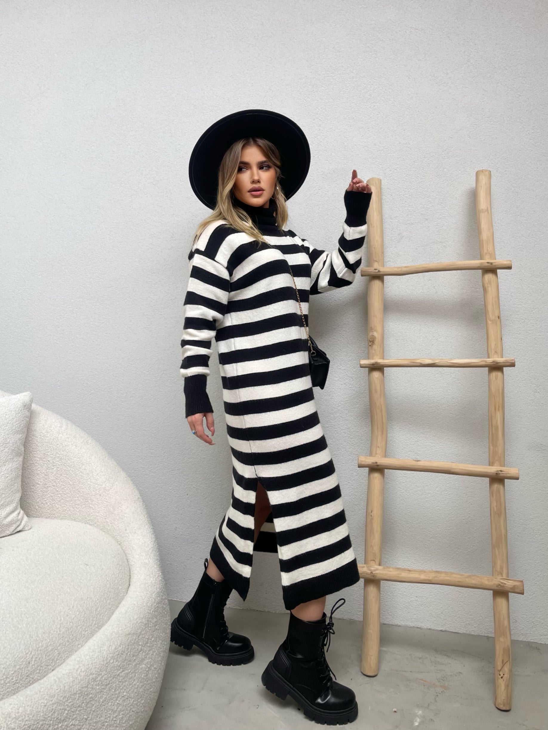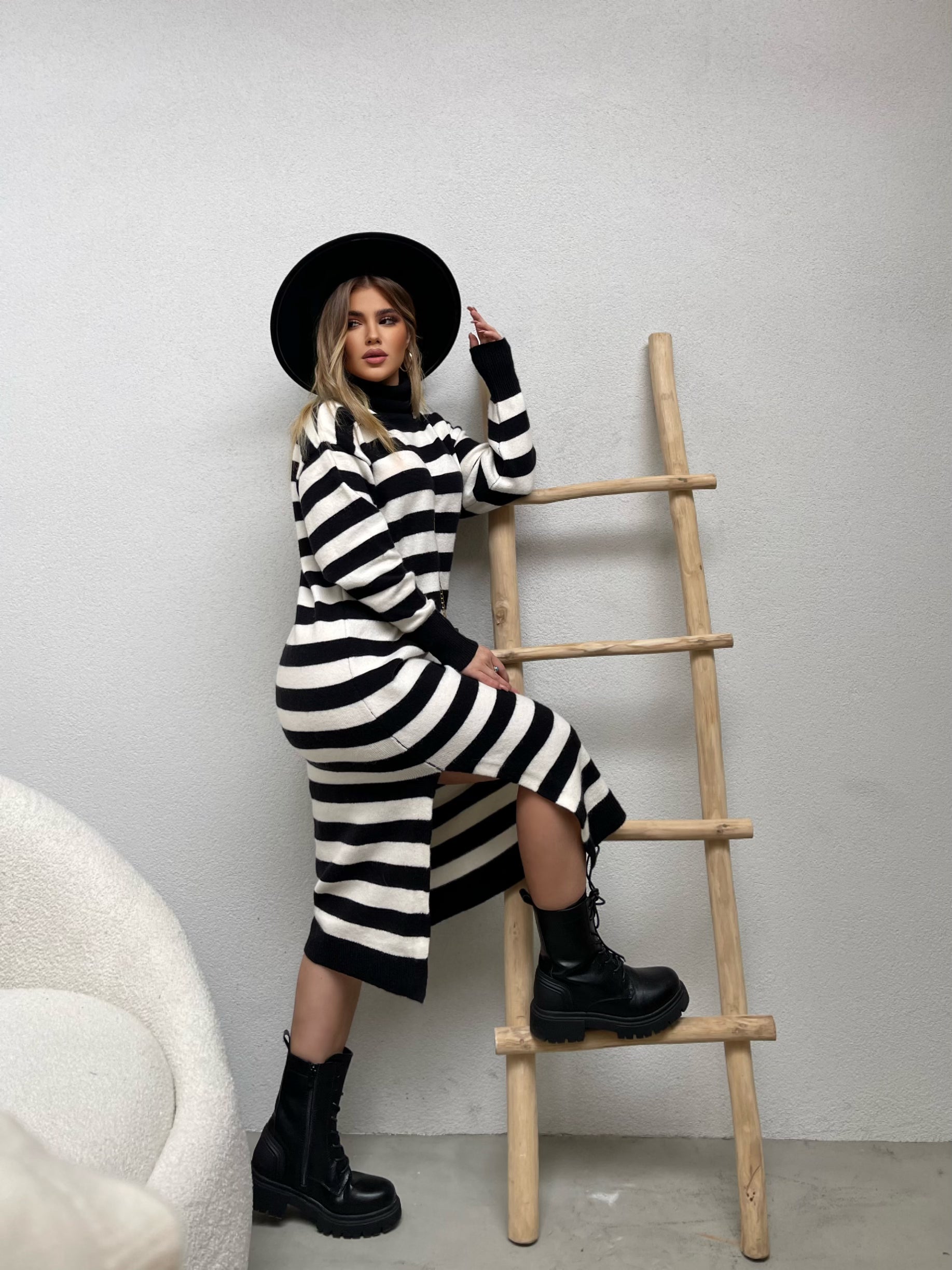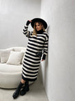 Fustan i trikotuar me golf me menge te gjata. Fustani eshte i gjate dhe me dizenjo me viza. Menget ne fund jane me doreza. Modeli vjen ne dy ngjyra: jeshil dhe i zi.