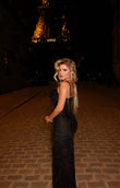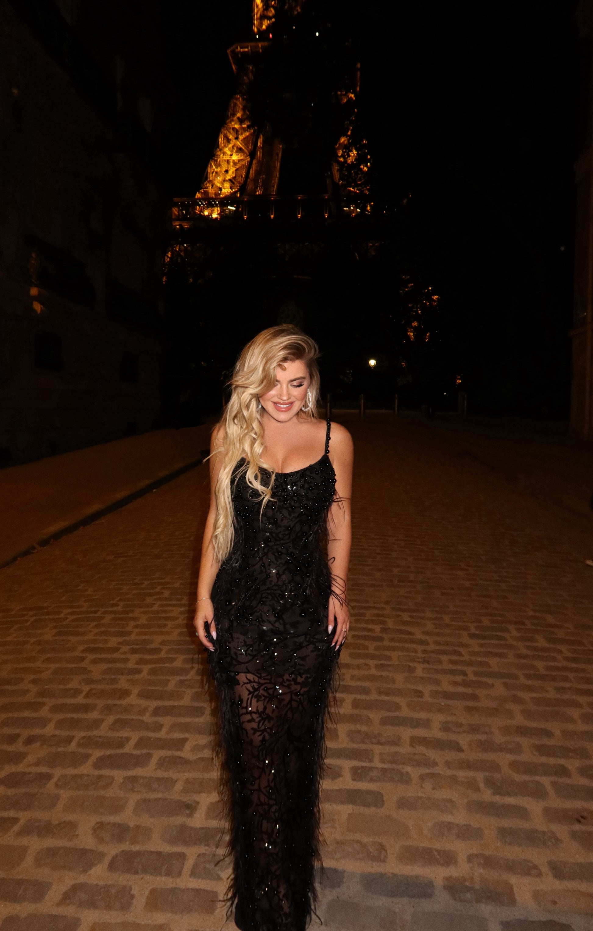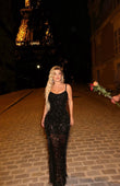 Fustan i gjate ne ngjyren e zeze me detaje teminash dhe rruazash. Vjen me astar ne pjesen e poshtme. Teper figurant dhe i vecante.
