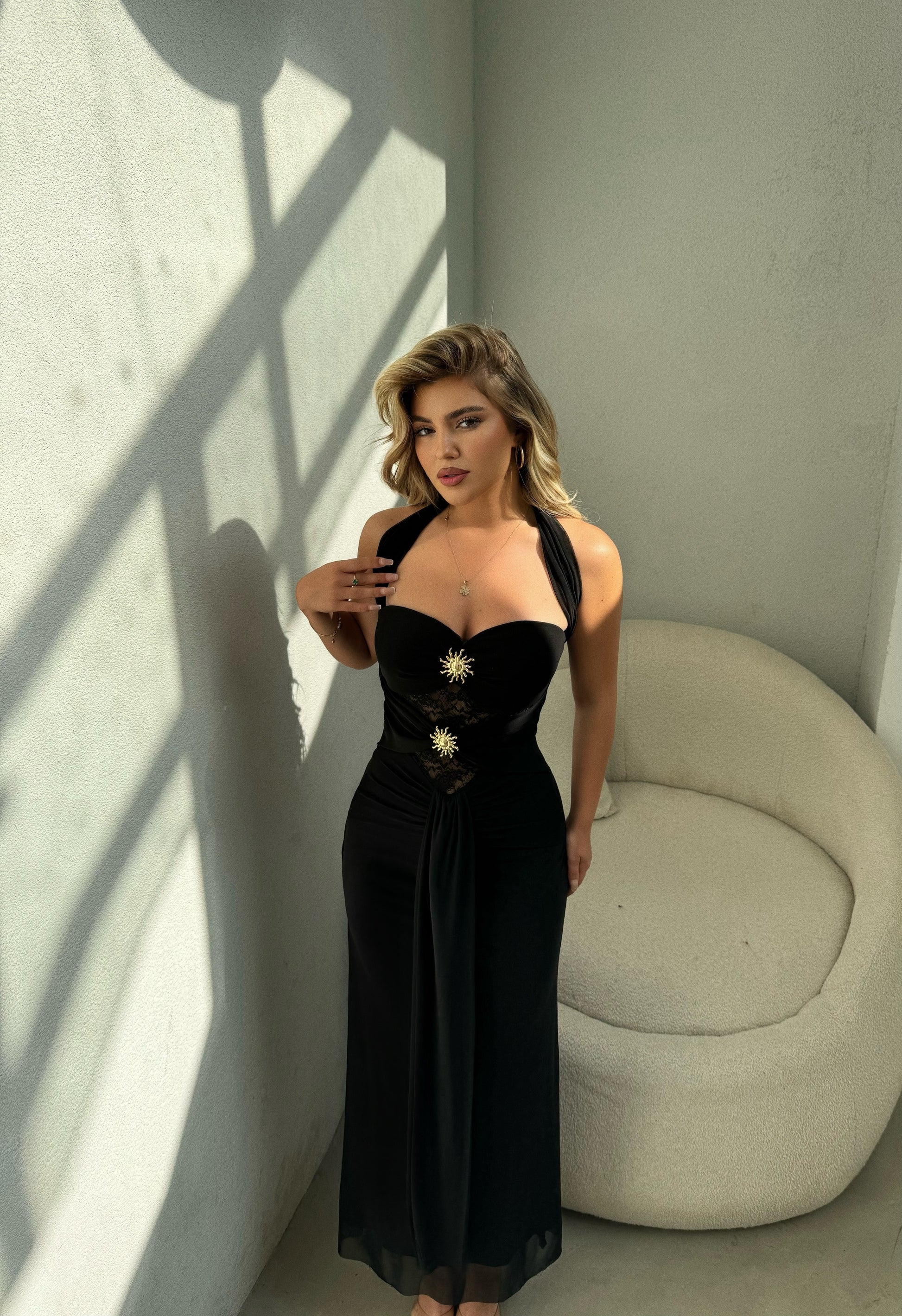 Fustan i gjate i hapur ne pjesen para. Eshte i lirshem ne pjesen e poshtme dhe rri yll ne trup. Ka material te plote dhe cilesi fantastike.