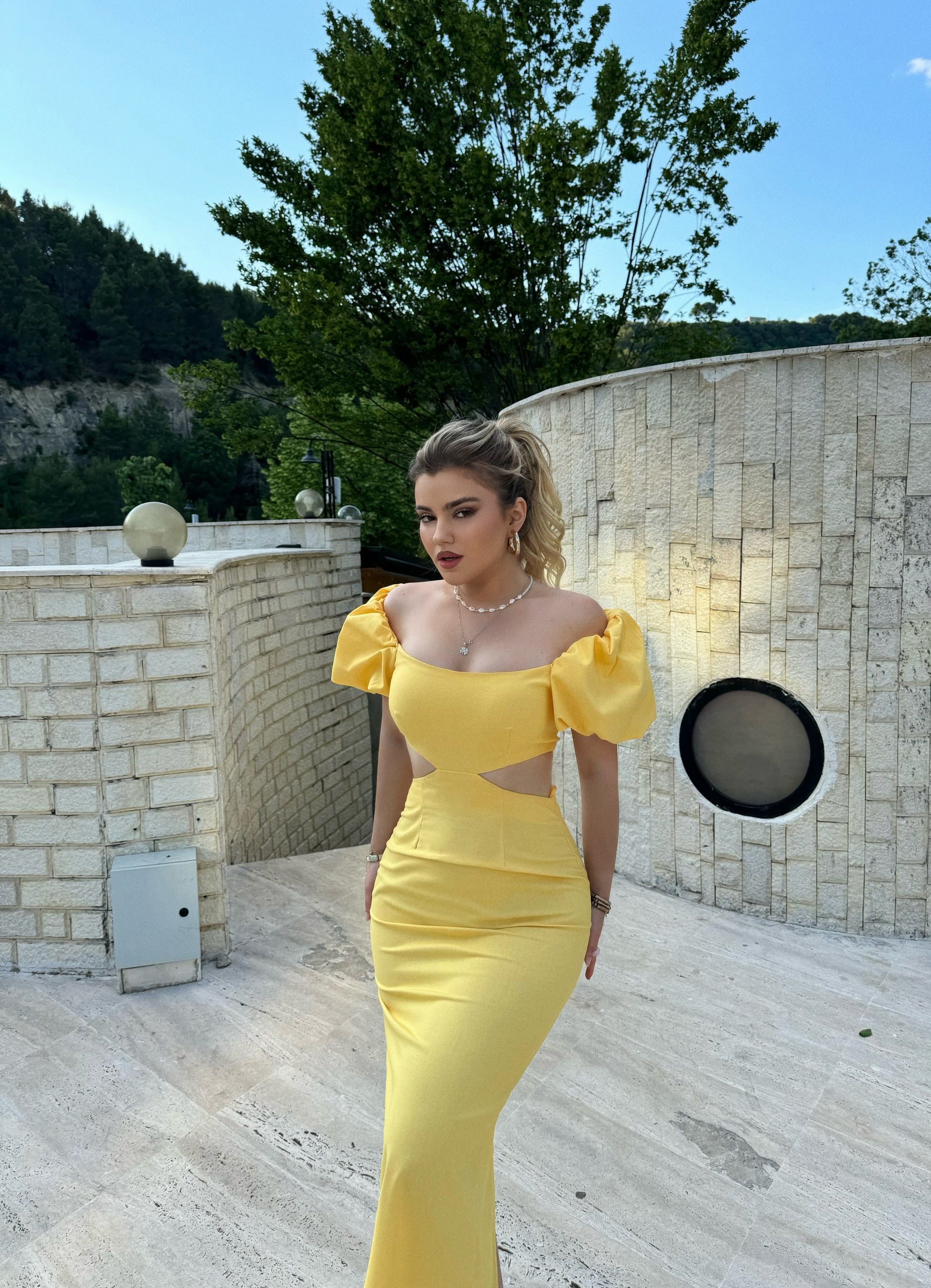 Fustan i gjate me te care anash dhe menge te fryra. Eshte me zinxhir ne pjesen mbrapa. Ka material te plote dhe cilesi fantastike.
