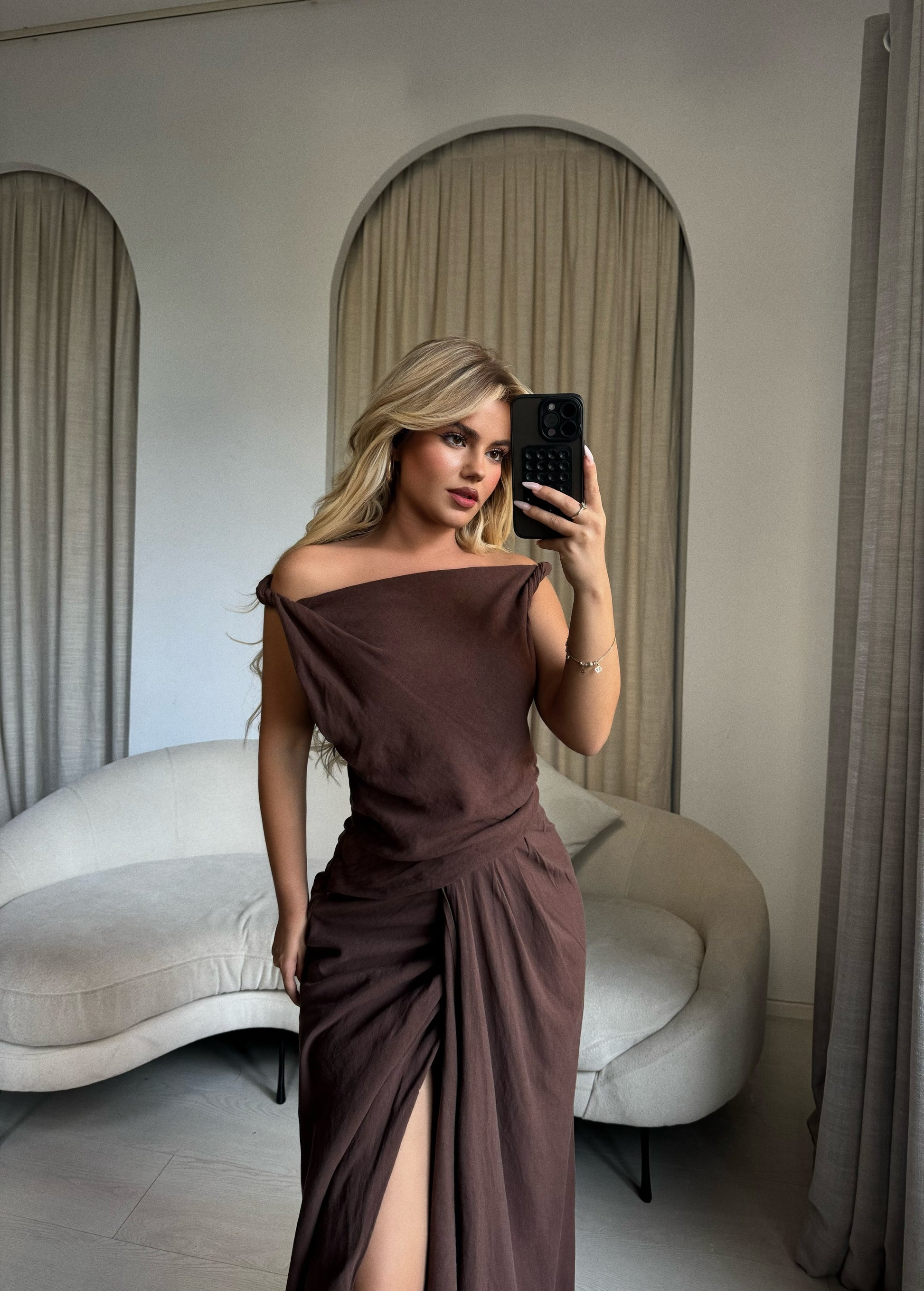 Fustan i gjate teper stil. Eshte me te care ne pjesen para dhe nje sup jashte. Eshte ne ngjyren e bardhe dhe kafe. Ka material te plote dhe cilesi fantastike.
