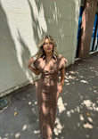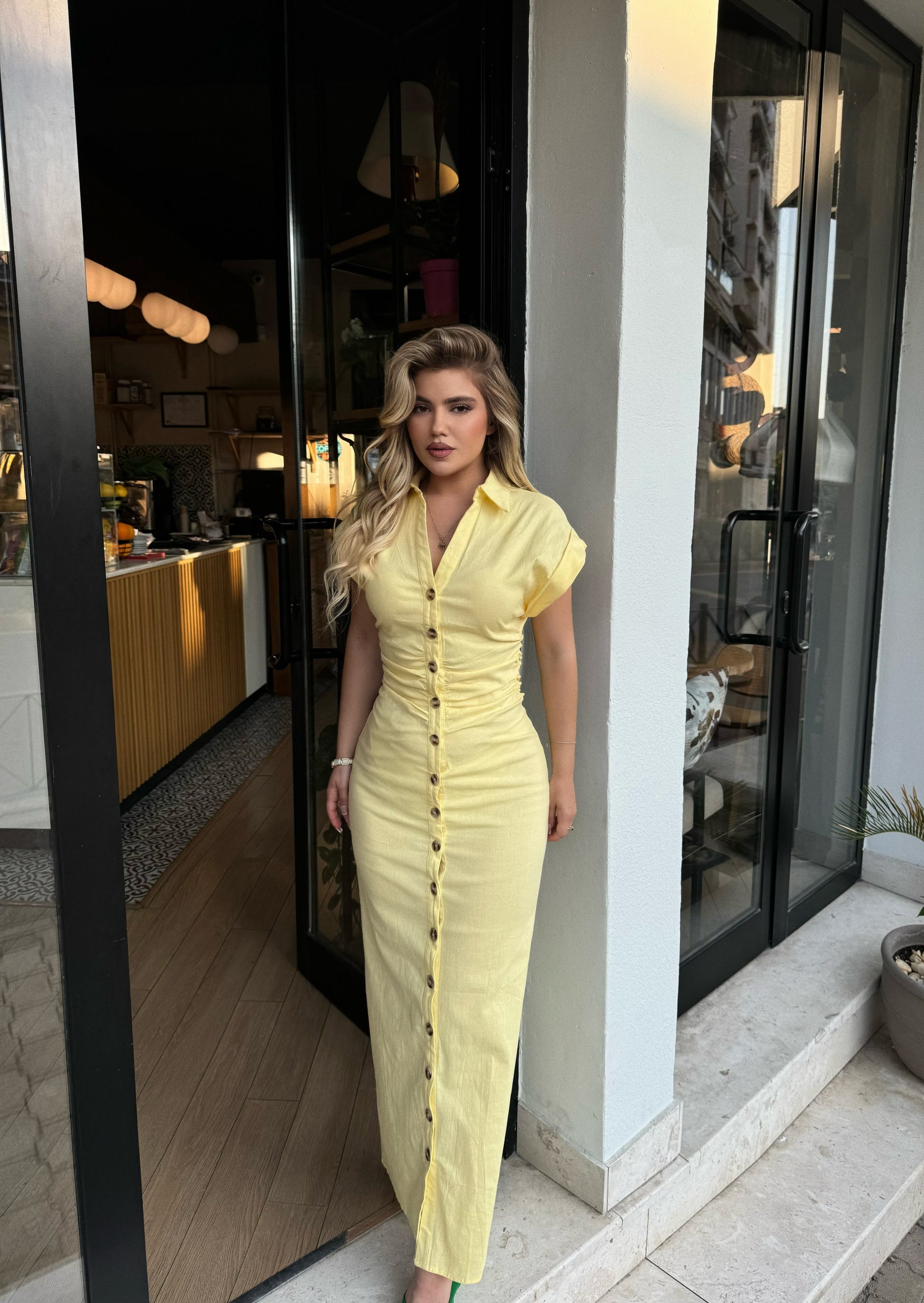 Fustan i gjate me kopsa para. Eshte me menge te shkurter dhe llastik anash ne bel. Ka material te plote dhe cilesi fantastike.