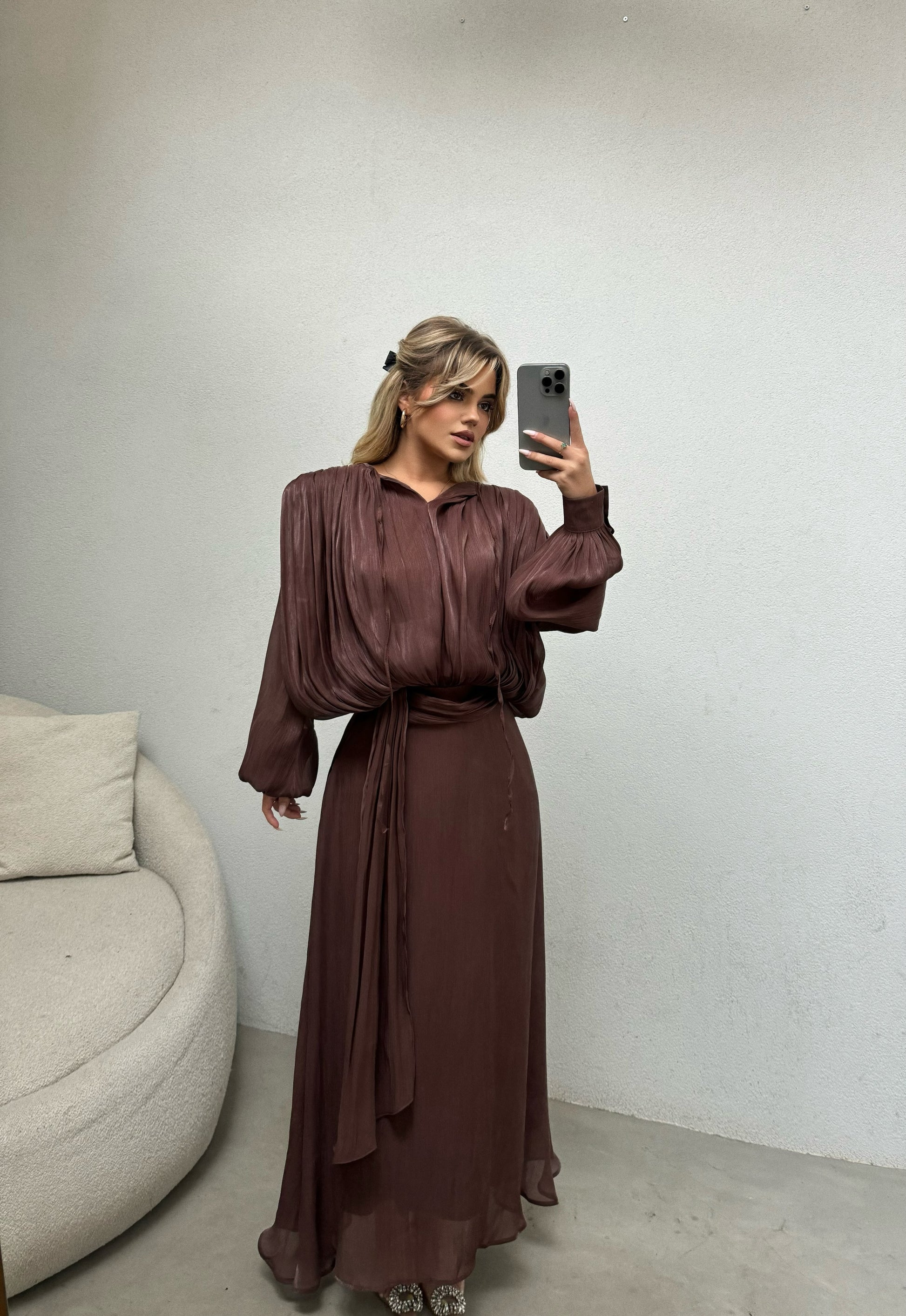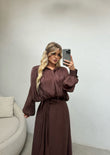 Fustan i gjate me shkelqim ne ngjyren kafe. Material i plote dhe me astar ne pjesen e poshtme. Teper elegant dhe figurant per cdo rast.