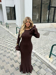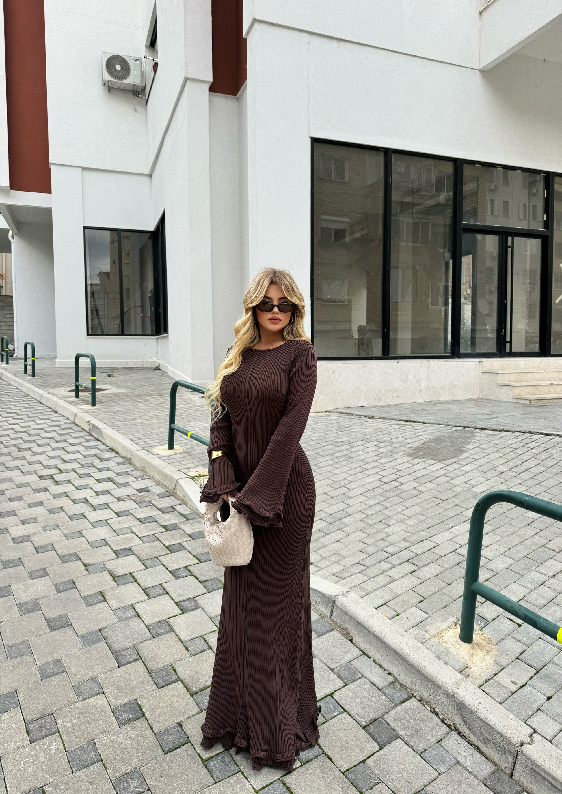 Fustan i gjate ne ngjyren kafe, material i plote dhe i bute. Lehtesishte i kombinueshem per ditet dhe komode.