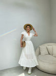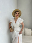 Fustan i gjate me krahe te shkurter me dantelle. Ka material te plote dhe cilesi fantastike.