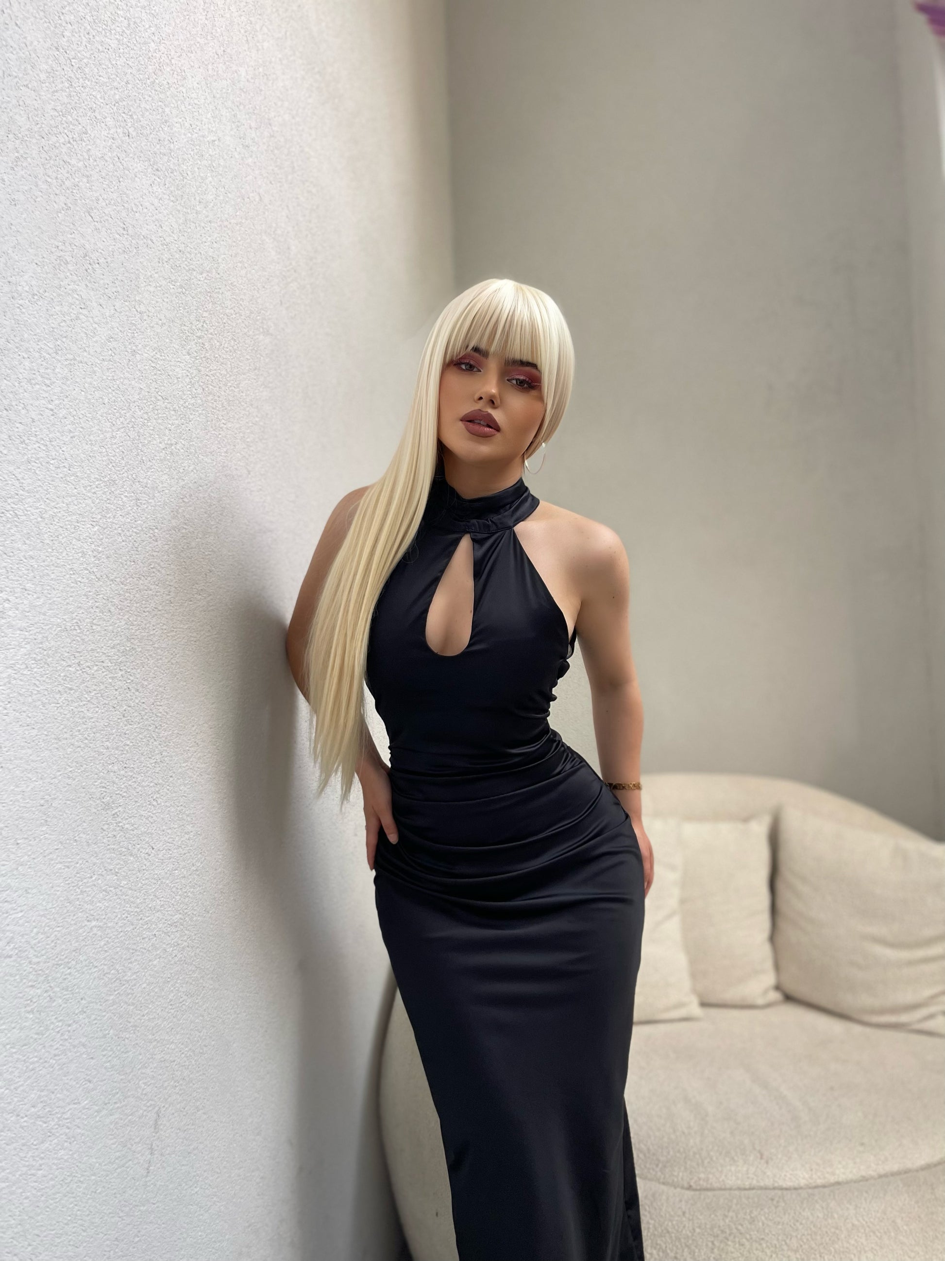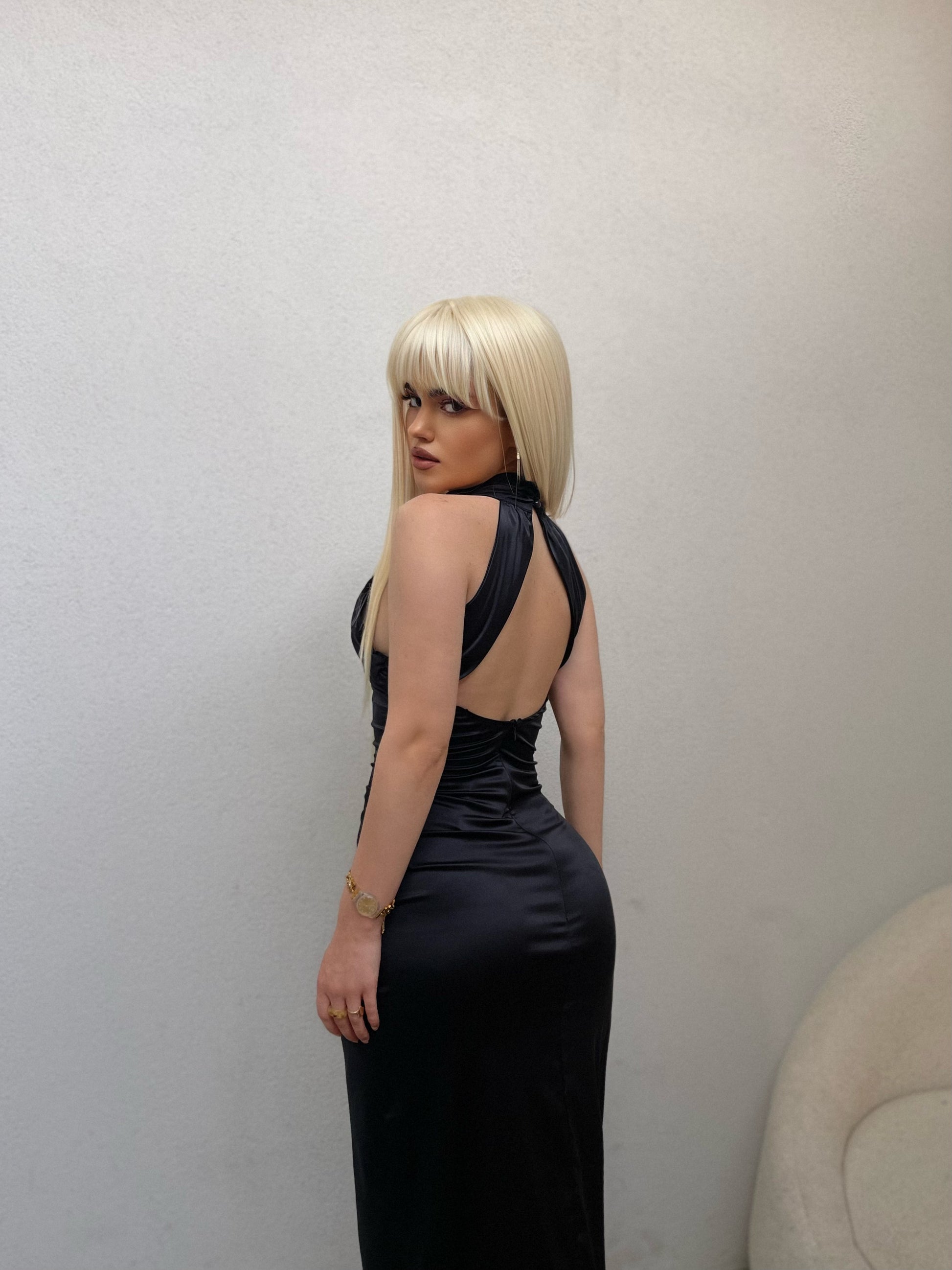 Fustan i gjate saten me lidhje ne qafe. Ka material elastik dhe eshte i hapur ne pjesen perpara. Cilesi fantastike dhe super stil.