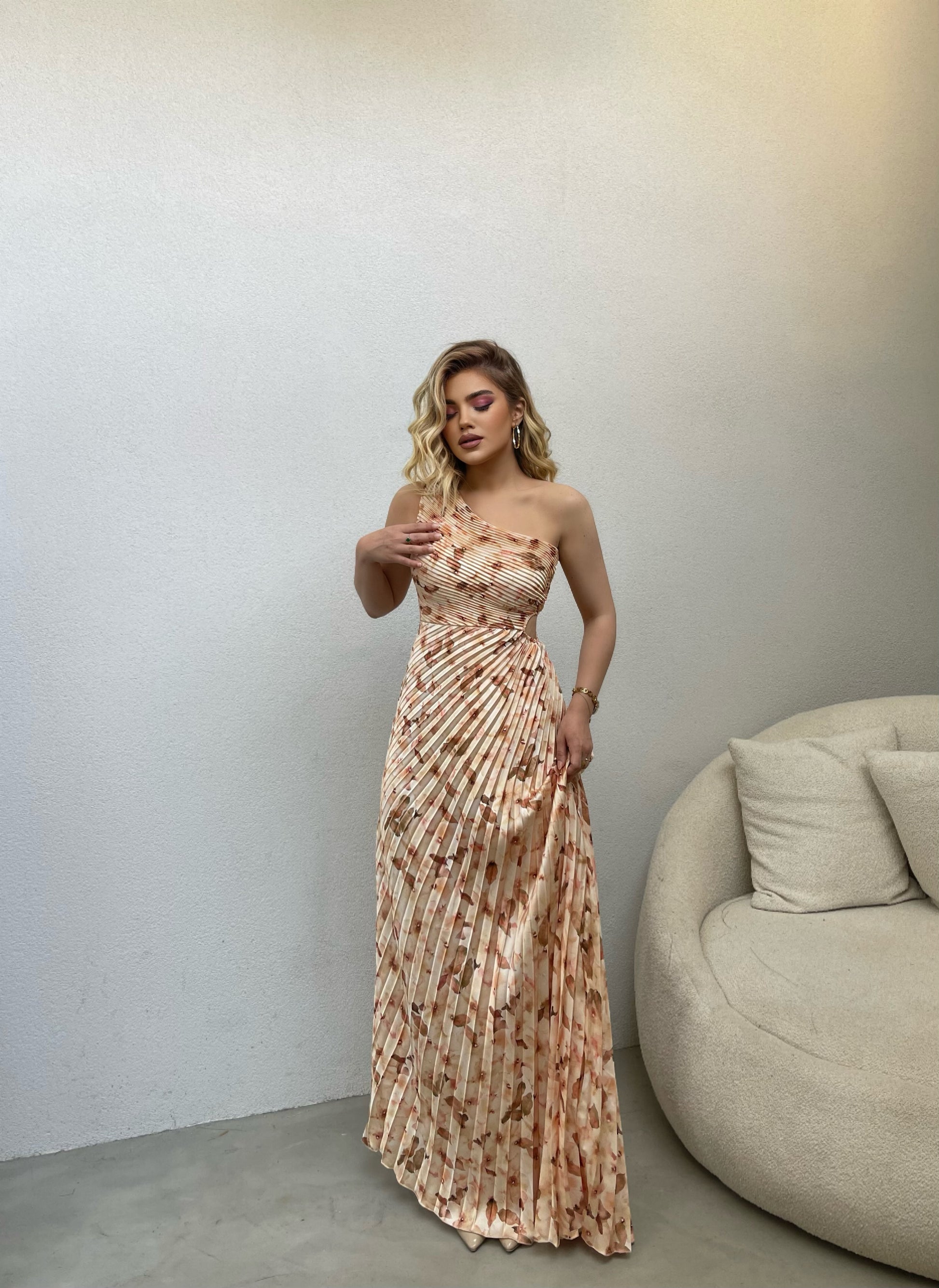 Fustan i gjate me nje krahe dhe te care tek beli. Vjen me pala te vogla dhe material te plote. Cilesi fantastike dhe super stil.