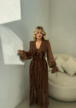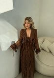 Fustan i gjate me pala ne ngjyren kafe. Vjen me lidhese ne pjesen e mengeve dhe jakes. Teper i vecante dhe i kombinueshem.