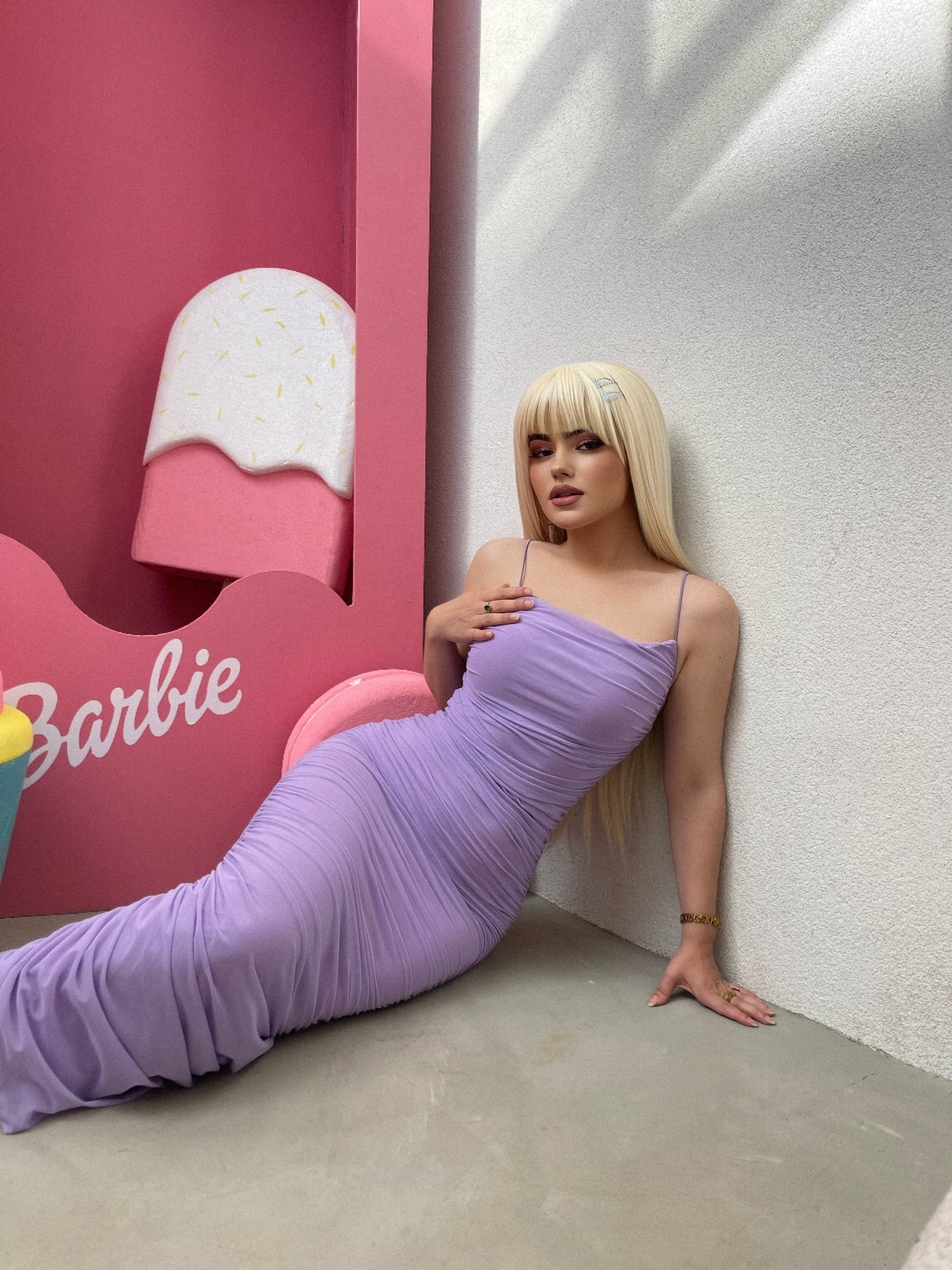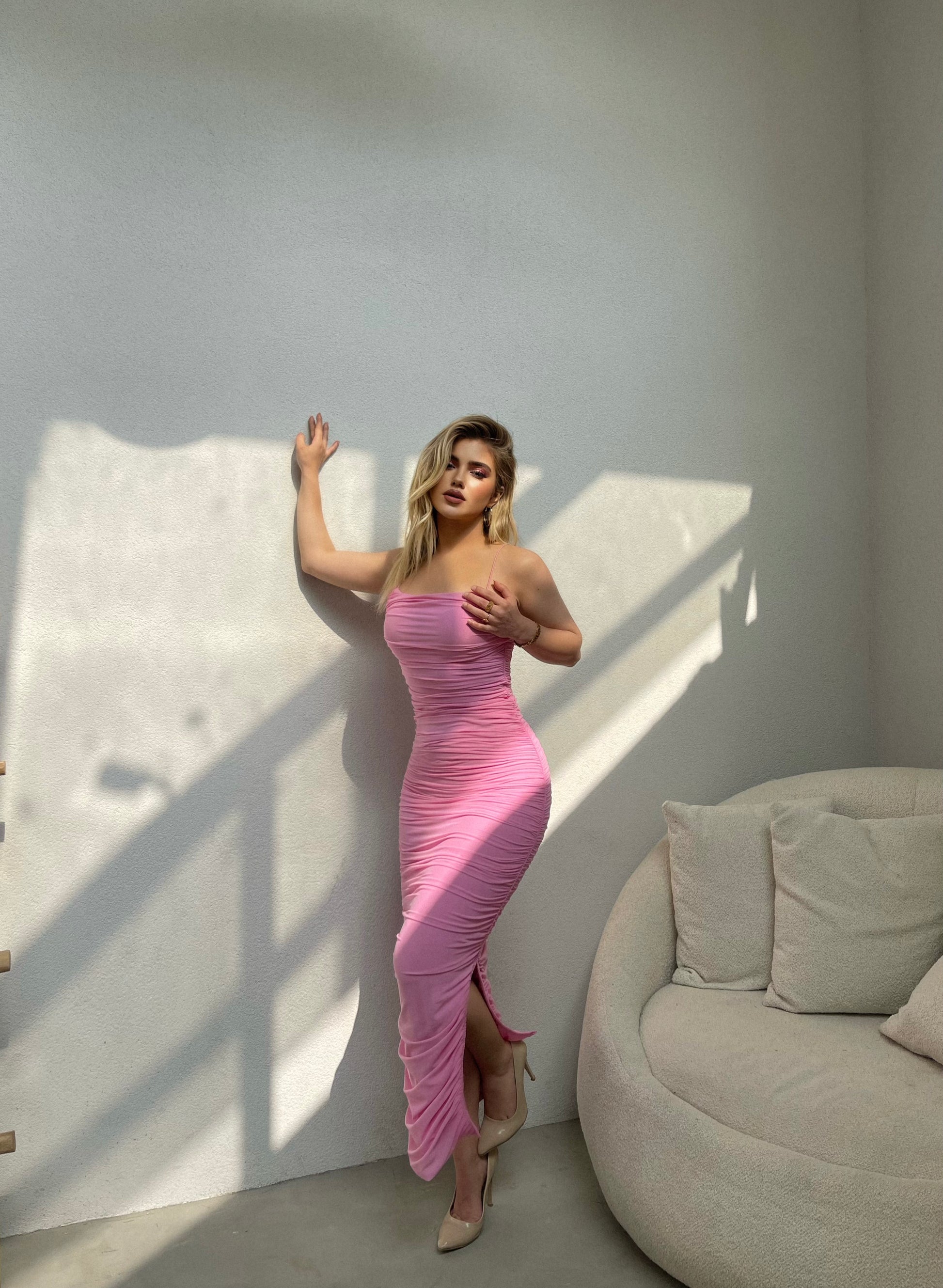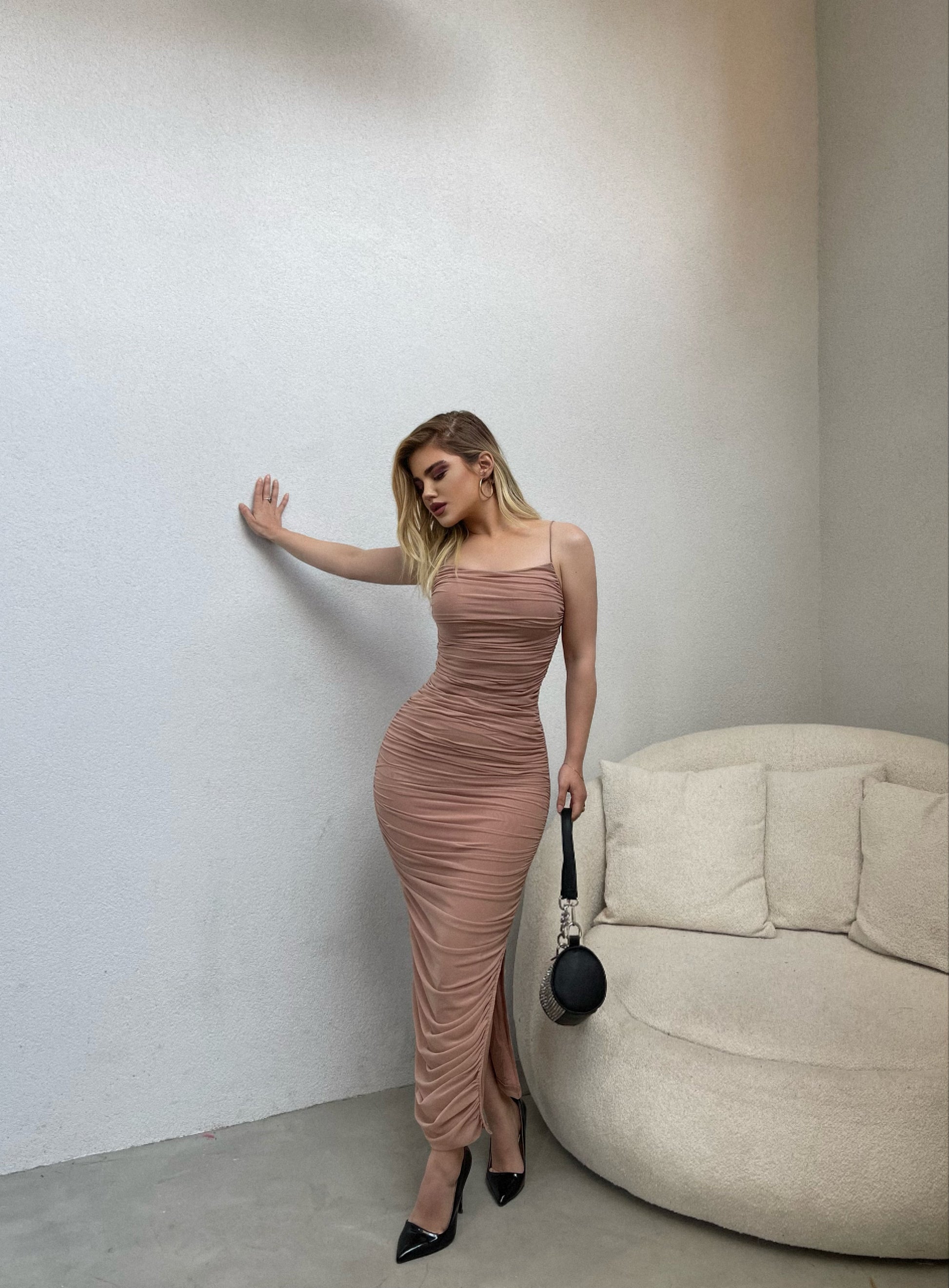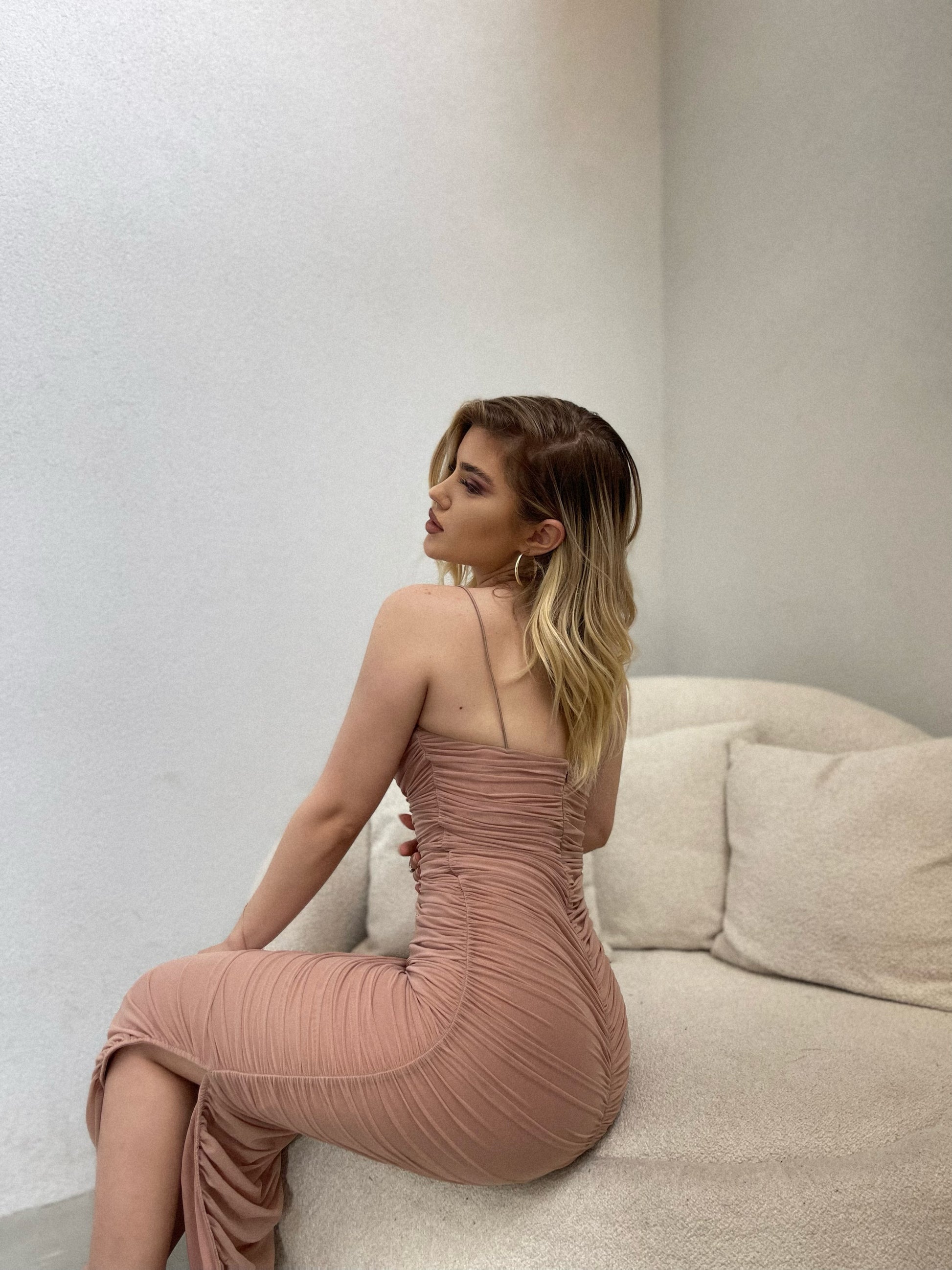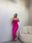 Fustan i gjate me rripa te holle. Eshte material elastik dhe pershtatet pas trupit. Ka nje te care ne pjesen e poshtme. Eshte material i plote.