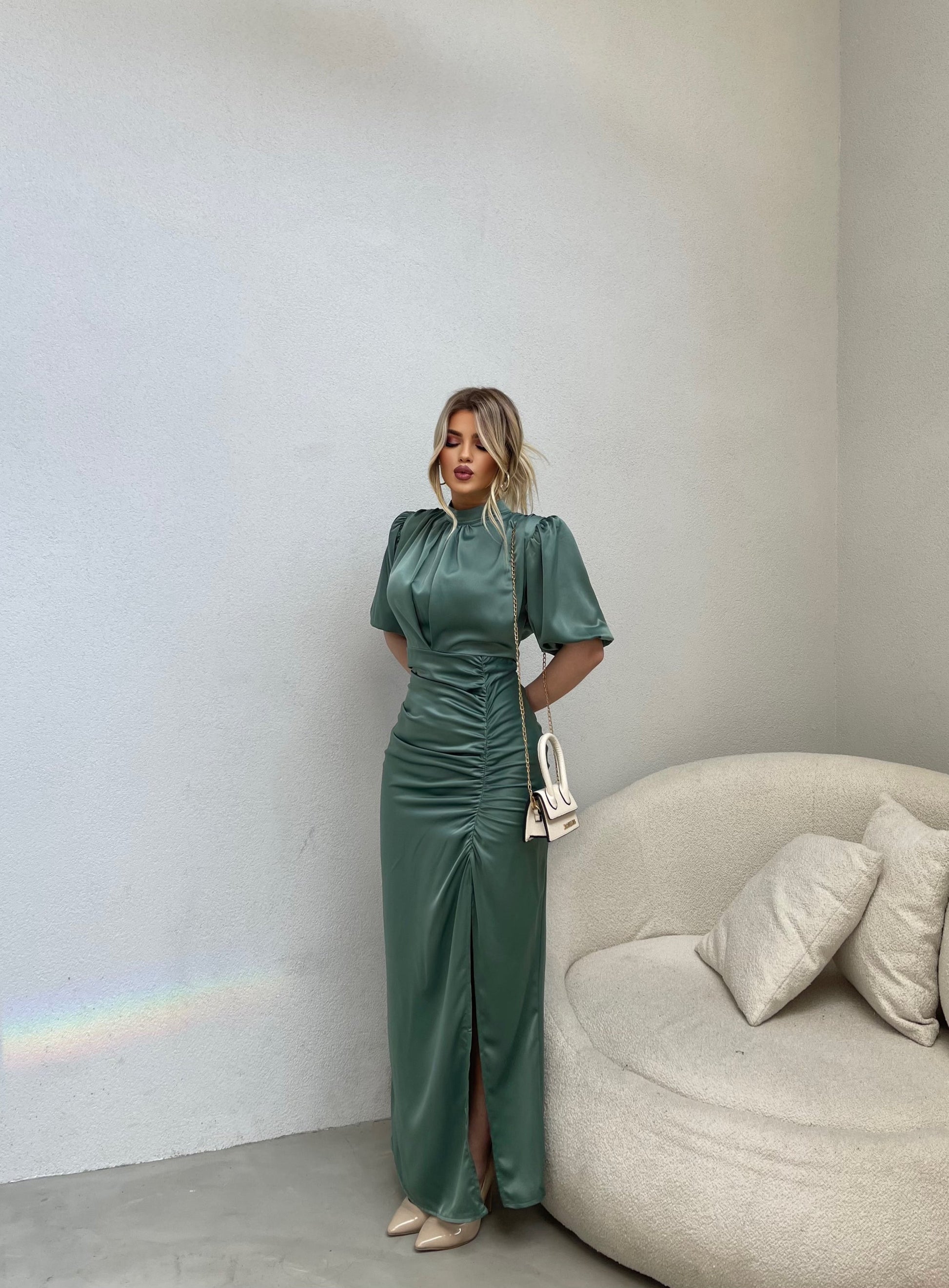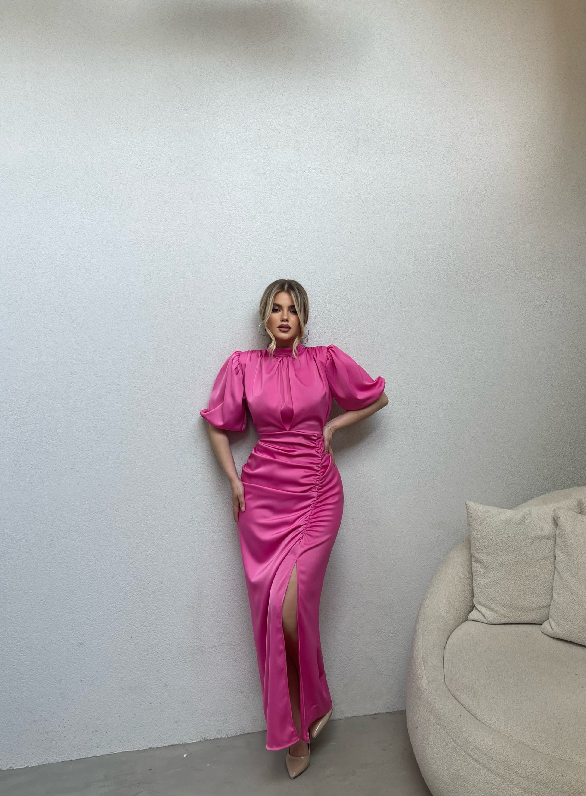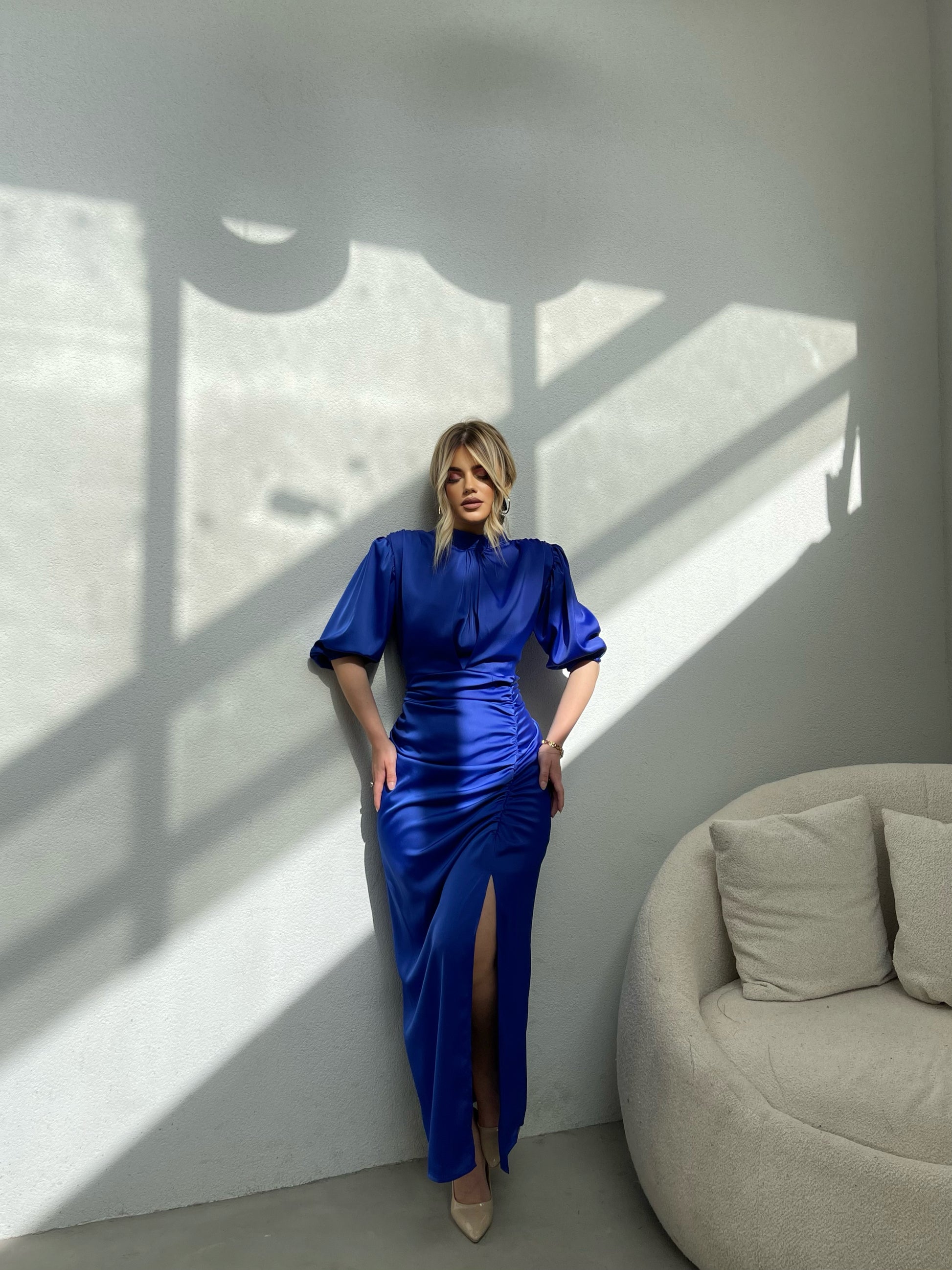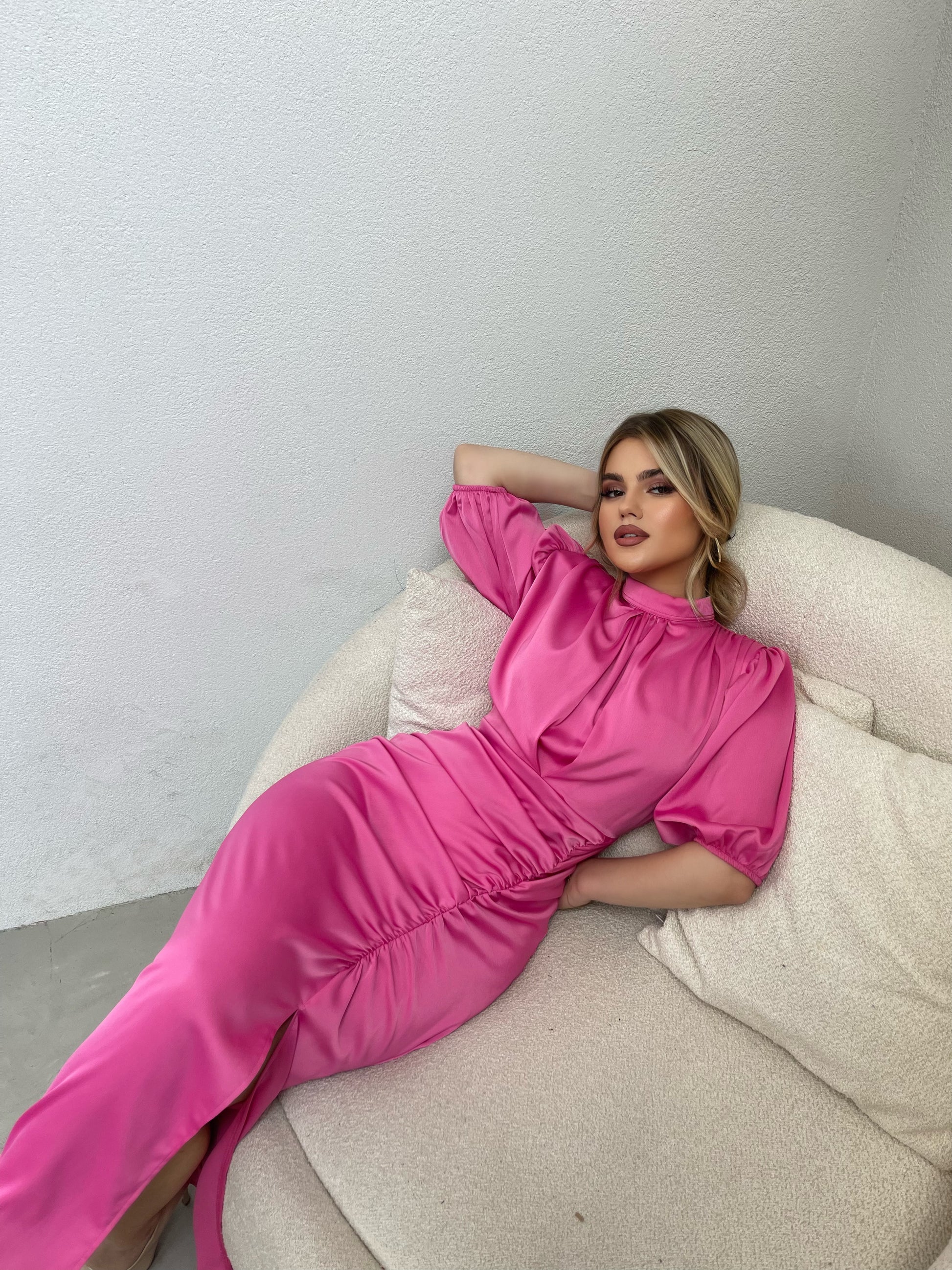 Fustan i gjate saten me te care para. Ka llastik anash ne bel dhe jake rrethore te mbyllur. Material fantastik dhe super stil.