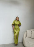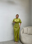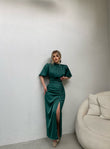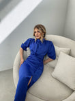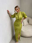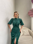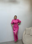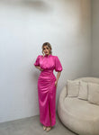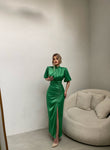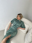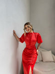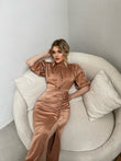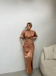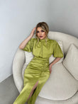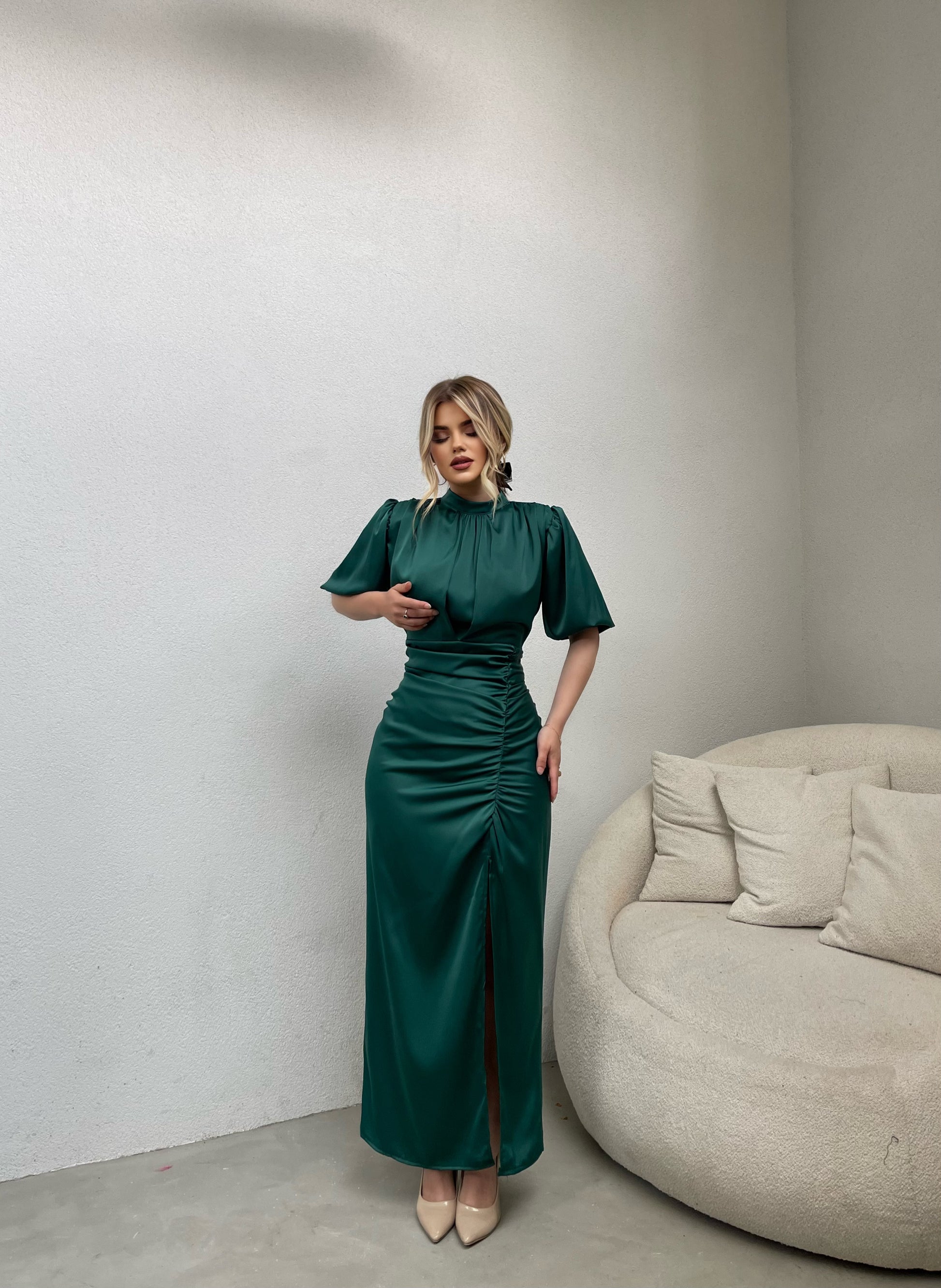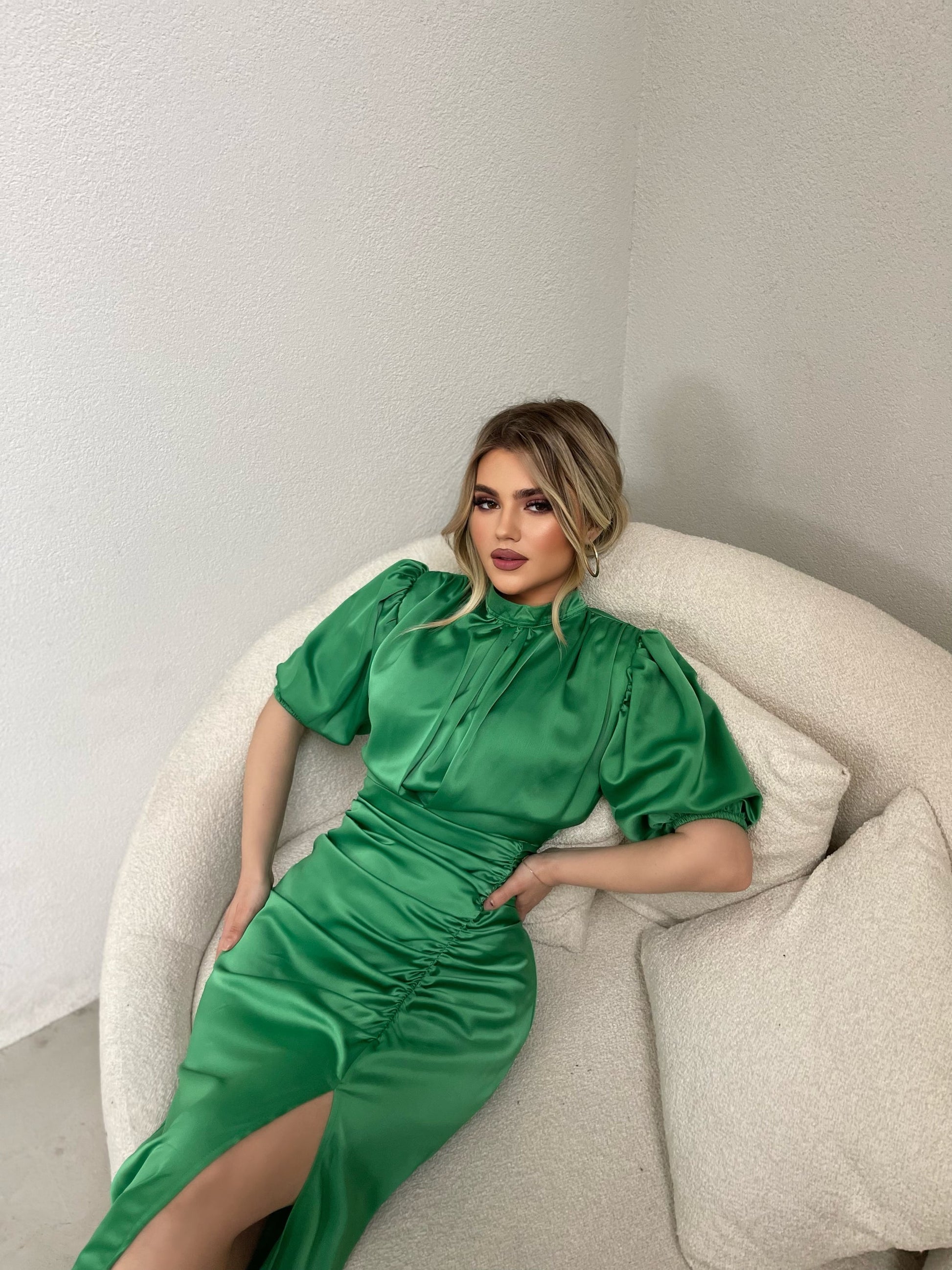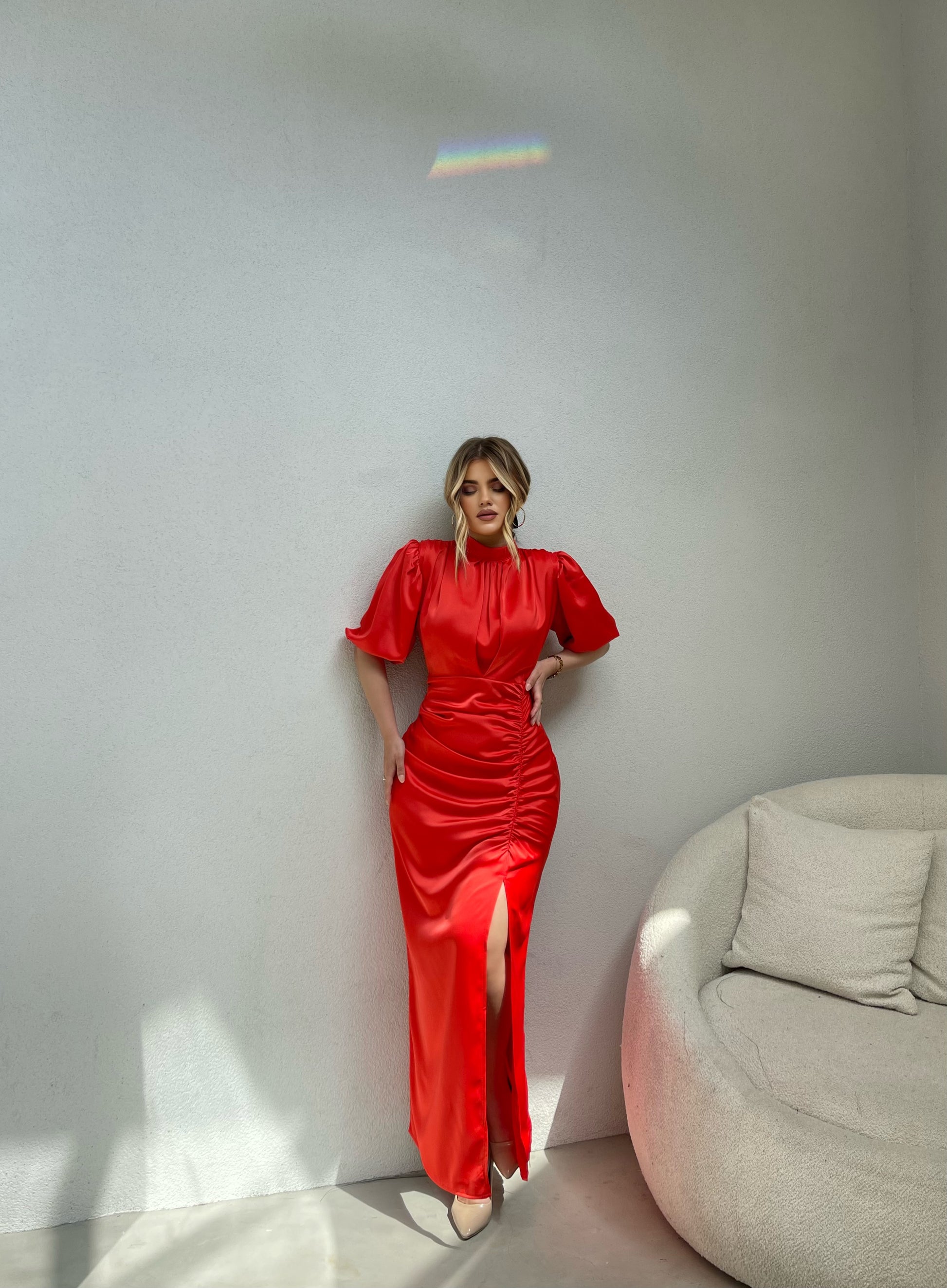 Fustan i gjate saten me te care para. Ka llastik anash ne bel dhe jake rrethore te mbyllur. Material fantastik dhe super stil.