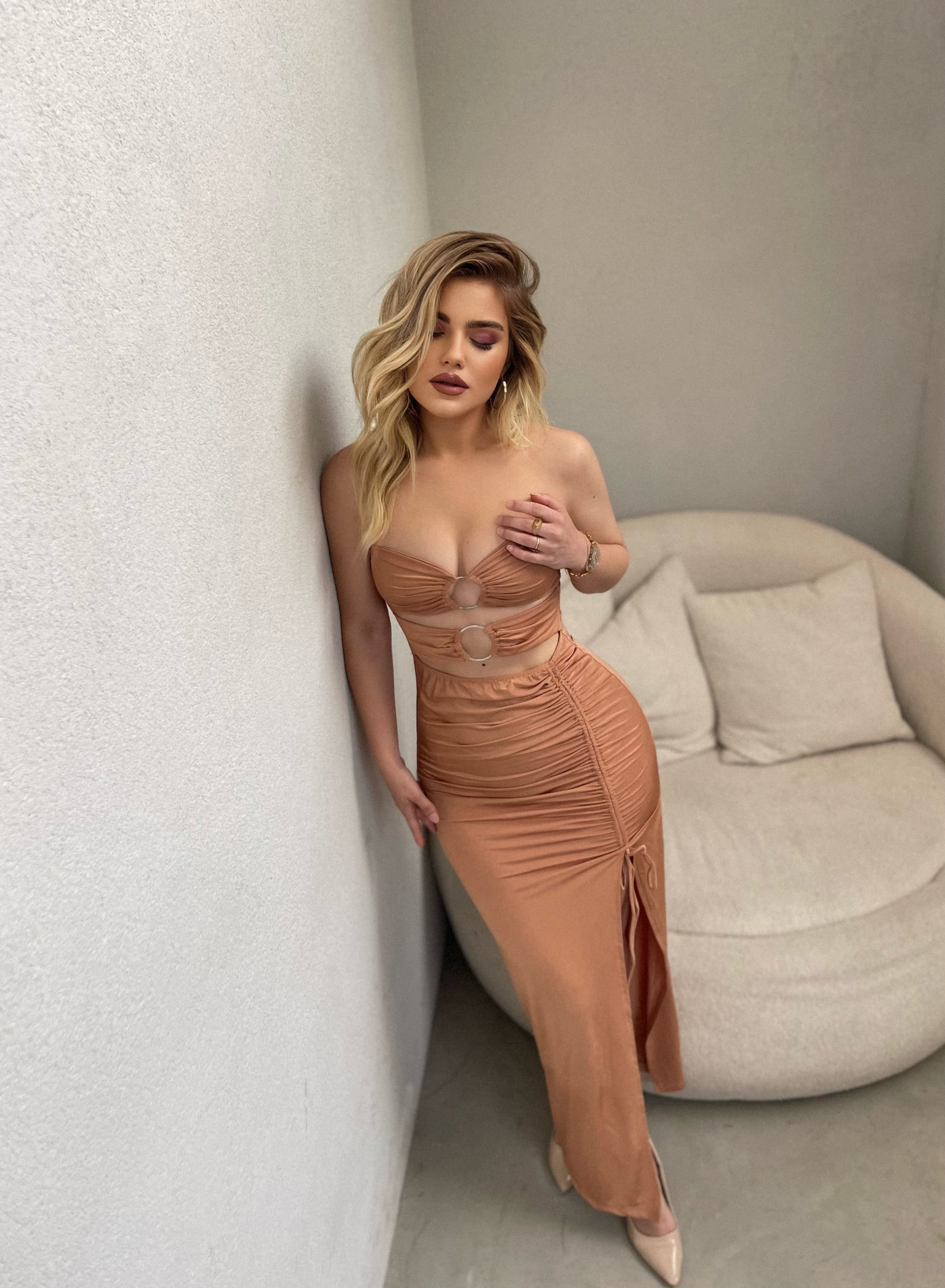 Fustan i gjate me te care perpara dhe llastik anash. Vjen ne forme busti dhe ka material elastik. Super cilesi dhe teper stil.